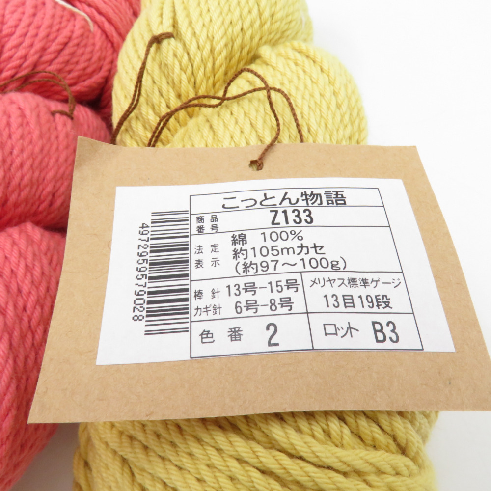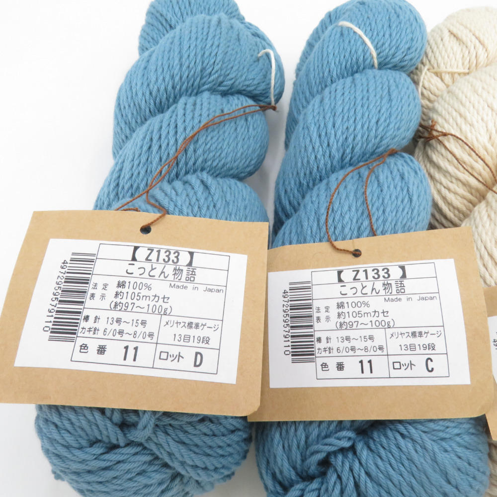 | 商品説明 | ※こっとん物語は名前が変わりNEWあみーコットンとなって「毛糸ピエロ」で販売中です。 サラサラの心地よさと、柔らかな肌触り。吸湿性に優れ、ベトつかずオールシーズン活躍してくれます。 極太タイプですが軽く柔らかさがあるのでスイスイ編めます。 上質なコットンを100%使用していますので肌に優しく大人から子供までお使いいただけます。 色番号:2番色 4番色 11番色×2 14番色 品番:【Z133】こっとん物語 重量/糸長:1カセ97~100g 約105m 使用針:棒針 13号~15号 かぎ針 6/0号~8/0号 メリヤス編み標準ゲージ:13目19段 | ||
