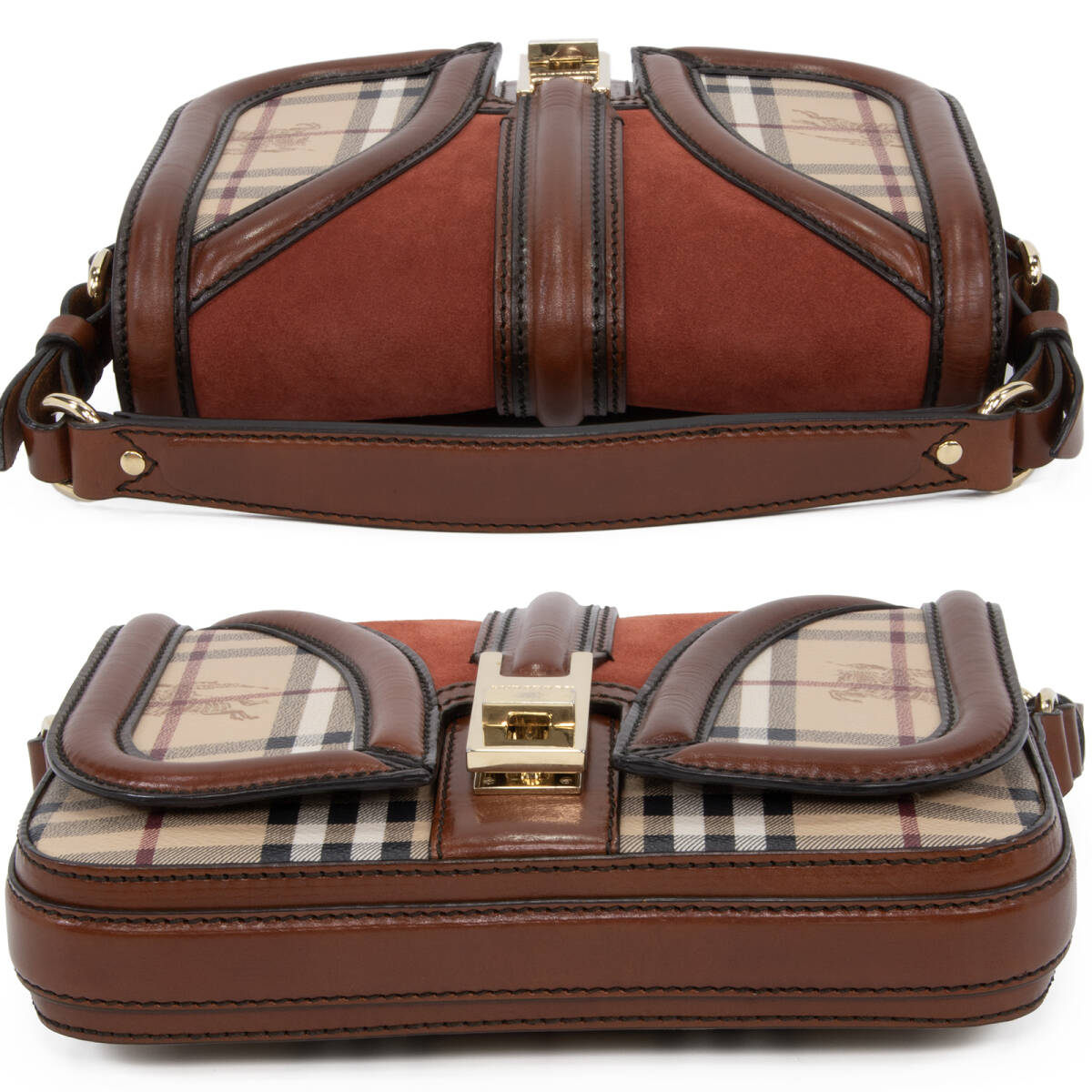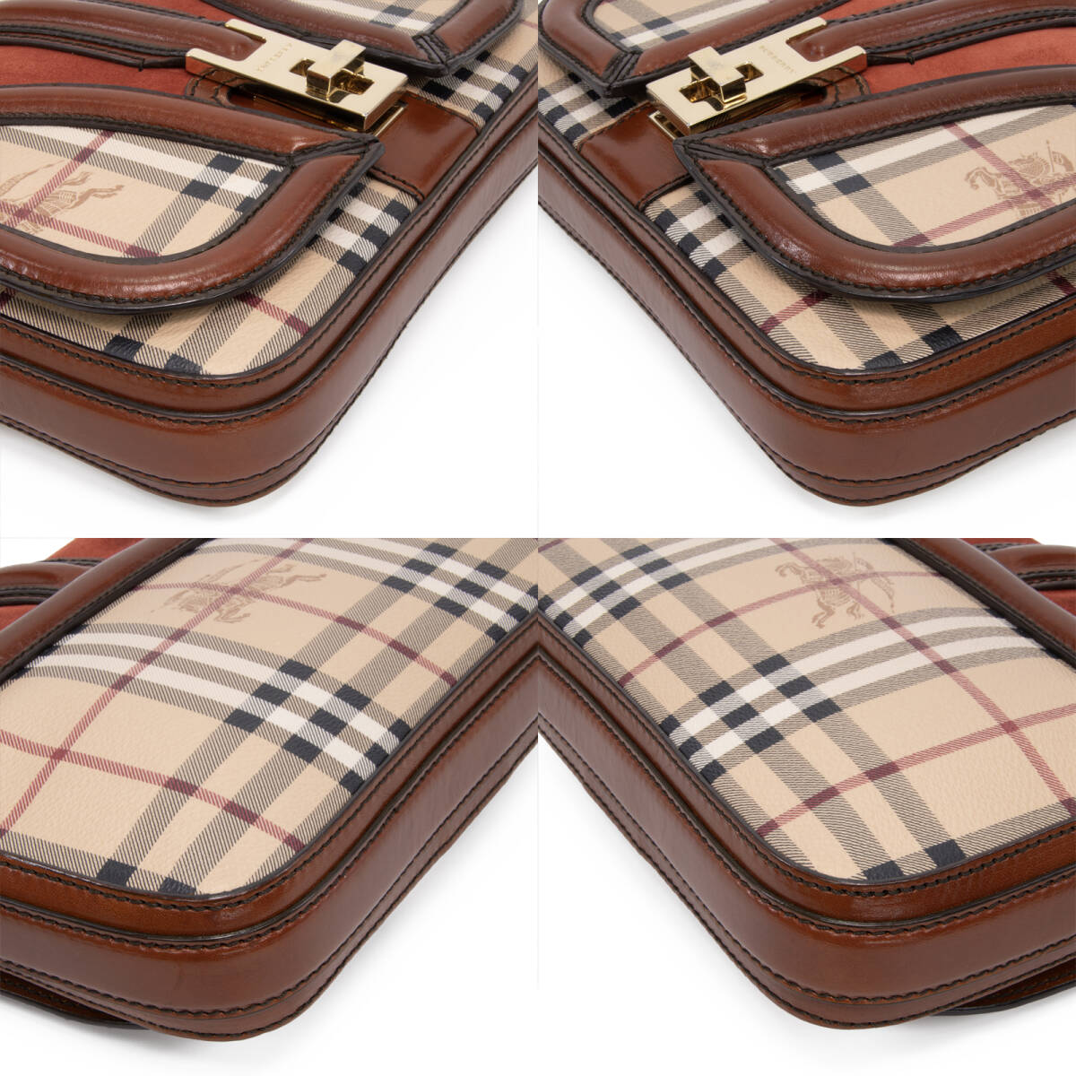 ブランドの象徴であるバーバリーチェックに、落ち着いたブラウン系のレザーと滑らかなレッド系のスエードを組み合わせた、大変美しいデザインが目を惹きます。