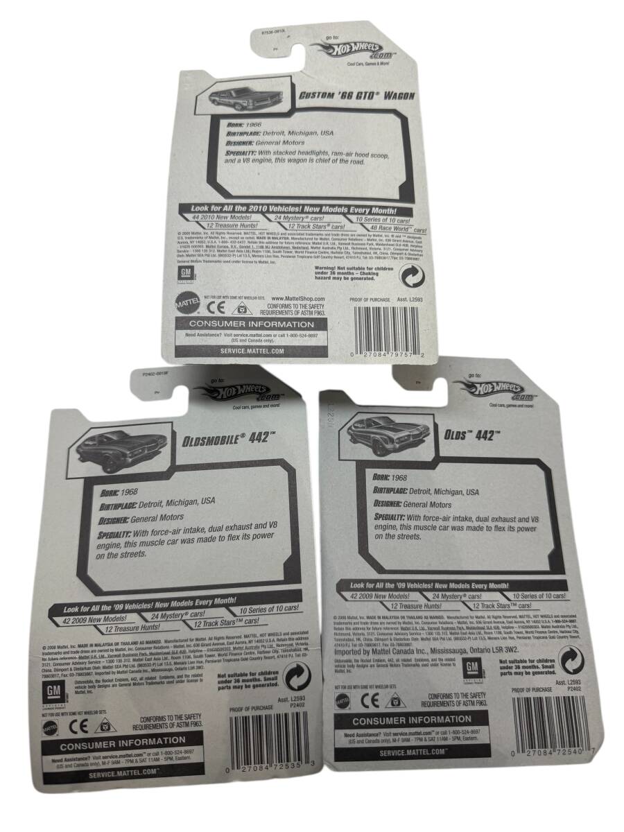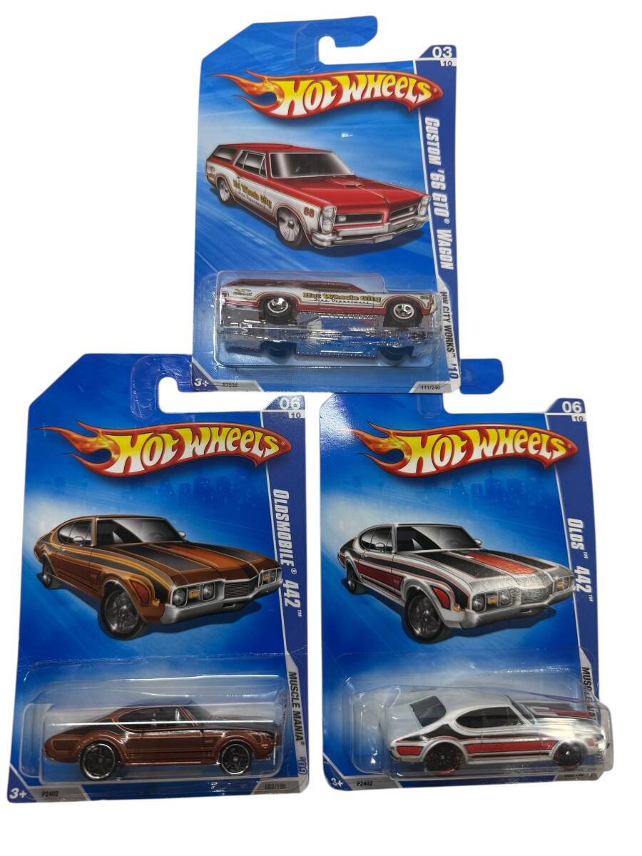 | ●S7-10-408 ホットウィール 3台 おまとめ『オールズモビル 442』色違い 2台『カスタム ‘66 GTO ワゴン』1台 未開封 1/64 | |||