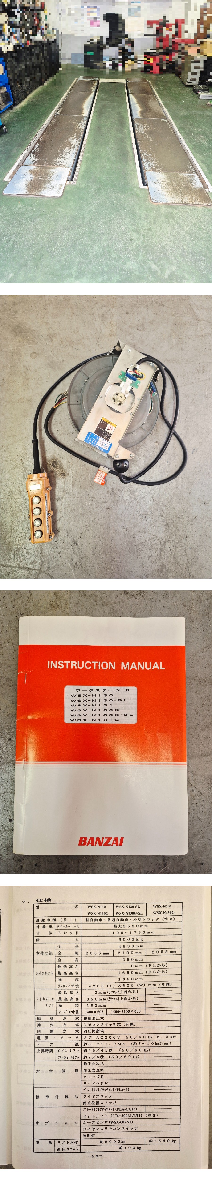 ■メーカー バンザイ ■型式 WSX-N130-1 ■仕様 対象車寸法 最大ホイールベース3500mm トレッド1100mm~1750mm 能力 3000kg 本体寸法 全長4830mm 全幅2055mm 全高290mm ランウェイ寸法 全長4200mm 全幅605mm フリーホイールリフトのテーブル寸法 全長1400mm 全幅605mm 揚程 ランウェイ1650mm テーブル350mm 駆動方式 電動油圧式 操作方法 リモコンスイッチ式 同調方法 油圧同調式 電源・モーター 3相 AC200V 50/60Hz 2.2kw エアー源 0.7~1.0MPa 本体重量 1960kg 油圧ユニット重量 100kg ※設置要領書はございますので、ご入用の方はメールでお送り致します。 ■状態 ※動作確認は行っております。 ※現在は撤去をし、倉庫に保管しております。 ※画像の白い配管カバーは付属しません。 ※アンカーボルト、作動油は付属しておりませんので、落札者様でご準備下さい。 ※欠品している小ネジ、エアーホースの継手等、汎用ショートパーツに関しましては、 落札者様でご準備下さい。 ※中古品の為、本体及び油圧ユニットにエアー漏れ箇所等あるかと思いますので、 ご理解の上、ご入札をお願い致します。 ※中古品の為、さび・傷・汚れはございます。 ■付属品 ※画像に写っているものが全てです。 |