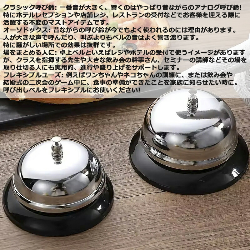 クラシック呼び鈴: 一番音が大きく、響くのはやっぱり昔ながらのアナログ呼び鈴! 特にホテルレセプションや店舗レジ、レストランの受付などでお客様を迎える際に活躍する不変のマストアイテムです。