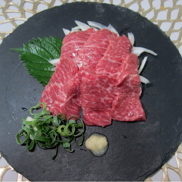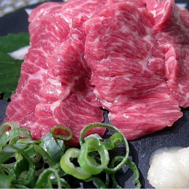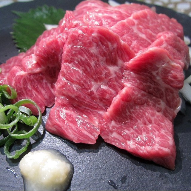 天然霜降馬刺しです。脂肪注入加工による霜降り肉ではありません。