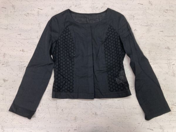 クレージュ courreges レトロ クラシック ブティック モード 古着 レース ノーカラー 比翼 ジャケット レディース リネン麻100% 38 黒 です。