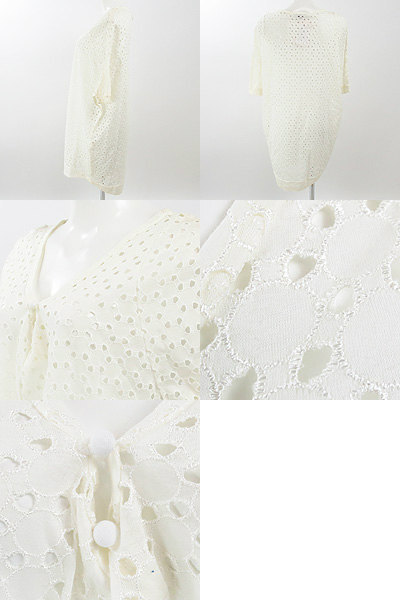 | カットワークデザインのエアリー感がお洒落な1枚♪ 首元のコロンとした包みボタンと滑らかな曲線を描いた 裾のラインがちょっとしたワンポイントになっています☆ ゆったりとしたルーズシルエットが程良い抜け感を演出。 細身のパンツと合わせたり、重ね着コーデでワンピースとして着たり アレンジ次第で色々と着まわせそうなアイテムでお勧めですよ。 後ろ身頃の方が少し着丈が長くなっています。 肩幅約31.5cm 着丈約82cm 袖丈約40cm 【サイズ】:(38) 【素 材】:(コットン100%) 【 色 】:(オフ白) 【程 度】:(A) 管理番号 54141006-010 316 025 | ||||