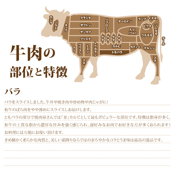 和牛のばら肉をやや薄めにスライスしお届けします。ともバラの部分で焼肉屋さんでは「並」カルビとして最もポピュラーな部位です。特徴は脂身が多く、和牛の上質な脂から濃厚な旨みを強く感じられ、通好みなお肉でお好きな方が多くおられます! お料理には万能にお使い頂けます。きめ細かく柔らかな肉質と、美しい霜降りならではのまろやかなコクとうま味は最高の逸品です。 |