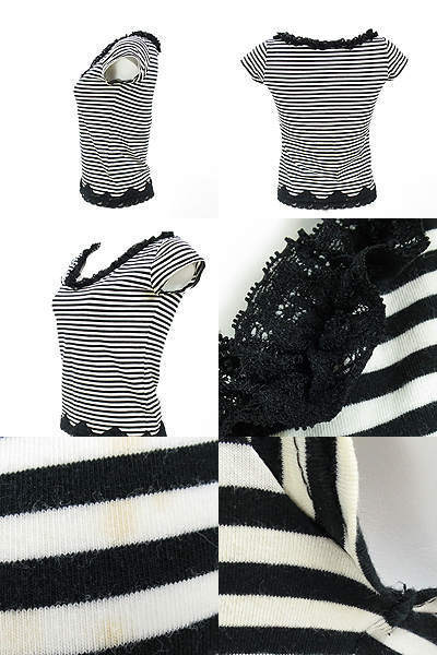 | 定番モノトーンボーダーで着まわし力抜群☆ フレンチスリーブですっきりとしたシルエット。 柔らかなコットンストレッチは着心地も文句なしです。 なだらかなVネックと裾にあしらわれたレースがとってもフェミニン! 重ね着コーデも綺麗に決まりますよ。 若干の毛羽立ちと、アームホールにうす汚れがみられます。 着丈約49cm 袖丈約9cm 肩幅約34cm バスト約80cm 【サイズ】:(2) 【素 材】:(綿 95% ポリウレタン 5%(レース ナイロン 85% ポリウレタン 15%)) 【 色 】:(黒白) 【程 度】:(BC) 20131220-015 424 011 | ||||