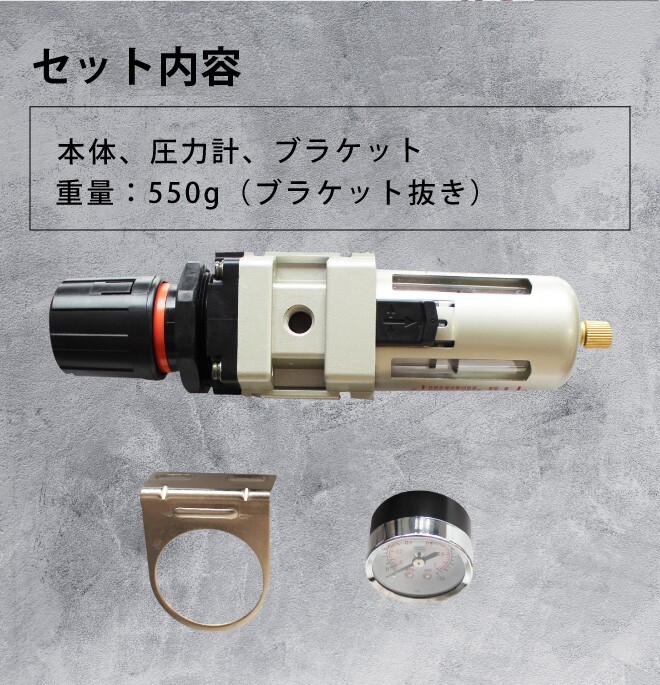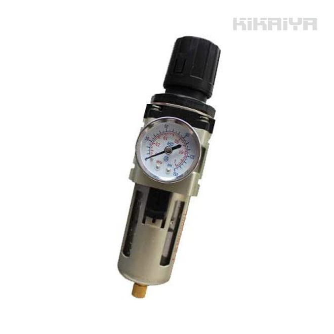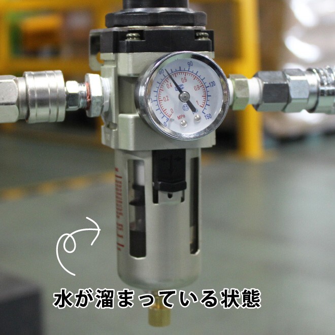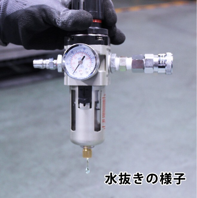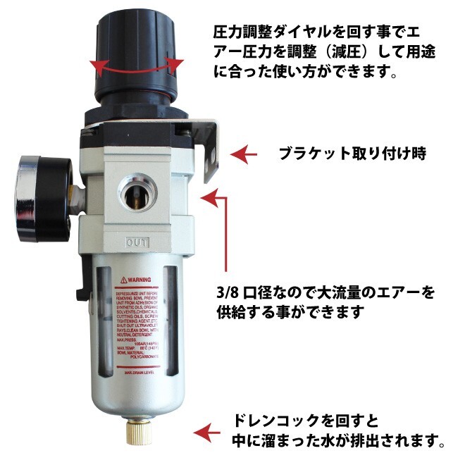 ・工具の寿命を短くする原因であるコンプレッサー、配管からの水分や不純物をエアーと分離して排出します ・圧力調整ダイヤルを回す事でエアー圧力を調整(減圧)して用途に合った使い方ができます ・3/8口径なので大流量のエアーを供給する事ができます ※エアー「IN」「OUT」の接続間違いは、エアー漏れや設定圧不良の原因となります |