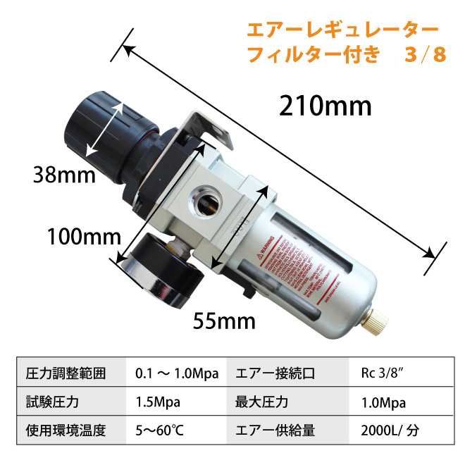 | 圧力調整範囲 | 0.1~1.0Mpa エアー接続口:Rc(PT)3/8" 最高圧力:1.0Mpa、試験圧力1.5Mpa 使用環境温度:5~60℃ |