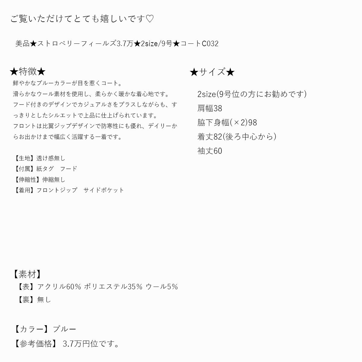 ★コメント★ *キャンセル・返品について ご入札後のキャンセル、 落札後の返品・交換はご遠慮頂いております。 商品に不備がある場合は取引ナビよりご連絡をいただけたら幸いです。 最後まで誠実に対応努めます。 何卒ご理解いただけますようよろしくお願い致します 。 *商品状態 出来る限り気持ち良くお召しいただけるよう心がけます★ 管理には十分気をつけております。 見落としやサイズ計測の誤差などがある可能性もございます。 完璧な商品をお求めの方はご入札をお控えくださいませm(_ _)m *付属品(インナーやベルト等)もともとついていたものが無い場合は記載いたします。 品質表示に記載がない場合は対応できないことをご了承くださいませ。 *即決について 大変申し訳ございません。オークション即決はお受けしてございません。 ご了承いただけたら幸いでございます。 *悪い評価のある方、新規IDの方の入札について こちらの判断によりお取り消しさせて頂く場合がございます。 出品者の立場から落札者様に規定を設け本当に申し訳ございませんが ご了承頂けたらと思います。 *ご質問について 日曜日(オークション終了日)ご質問の返信が出来ない事がございます。 購入時期、購入価格等わかる物に関してはできる限り記載をいたします★ その旨のご質問に関しても同様に返信できない場合がございます。 ご了承下さいませ。 不便でございますがご了承いただけたら幸いです。 毎週火曜日500着程、新しい商品を出品してございます! 日曜日、月曜日22時から23時終了するよう設定してございます。 お時間がございましたらご覧いただけましたら嬉しく思います★ 何かございましたらお気軽にご質問お待ち申し上げます! |