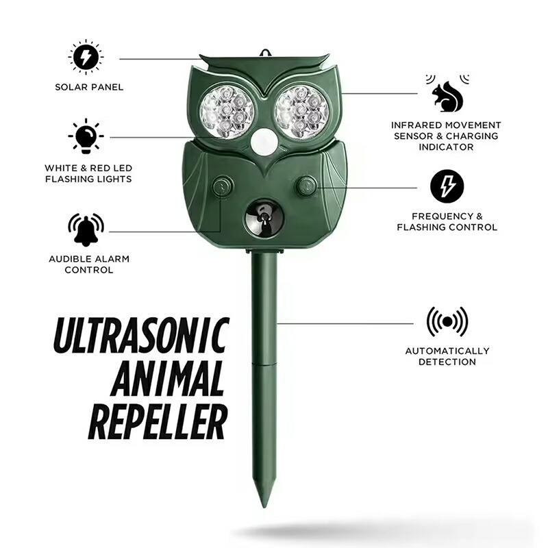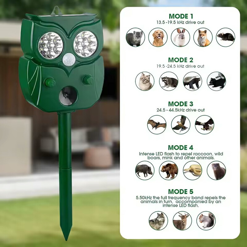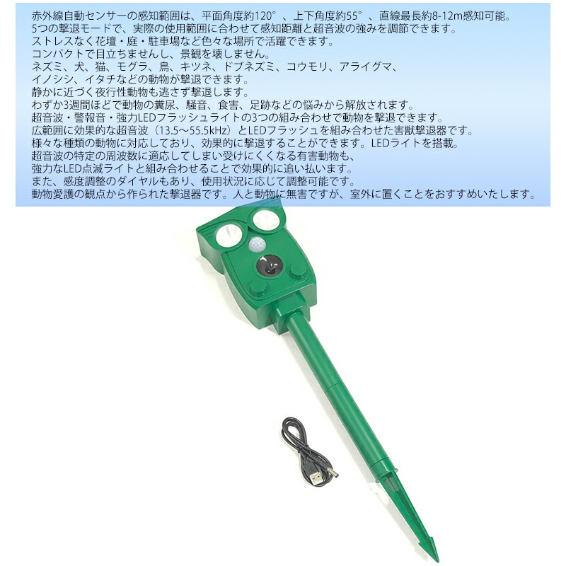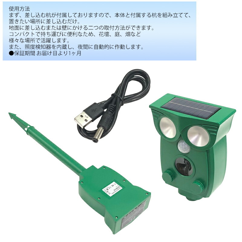 広範囲に効果的な超音波(13.5~55.5kHz)とLEDフラッシュを組み合わせた害獣撃退器です。