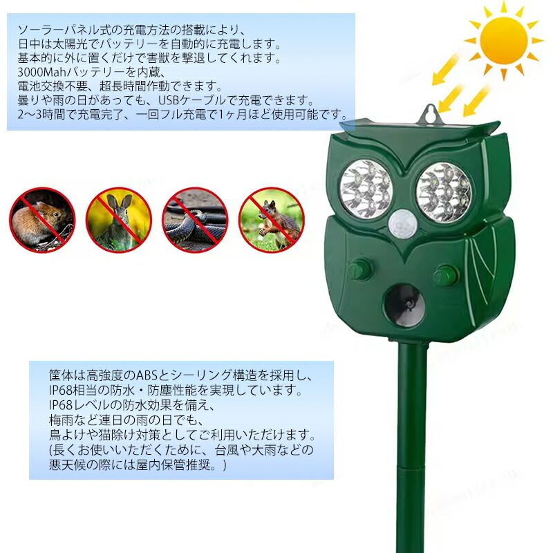 超音波・警報音・LEDライトで動物を撃退:本動物撃退器は超音波・警報音・強力LEDフラッシュライトの3つの組み合わせで動物を撃退できます。