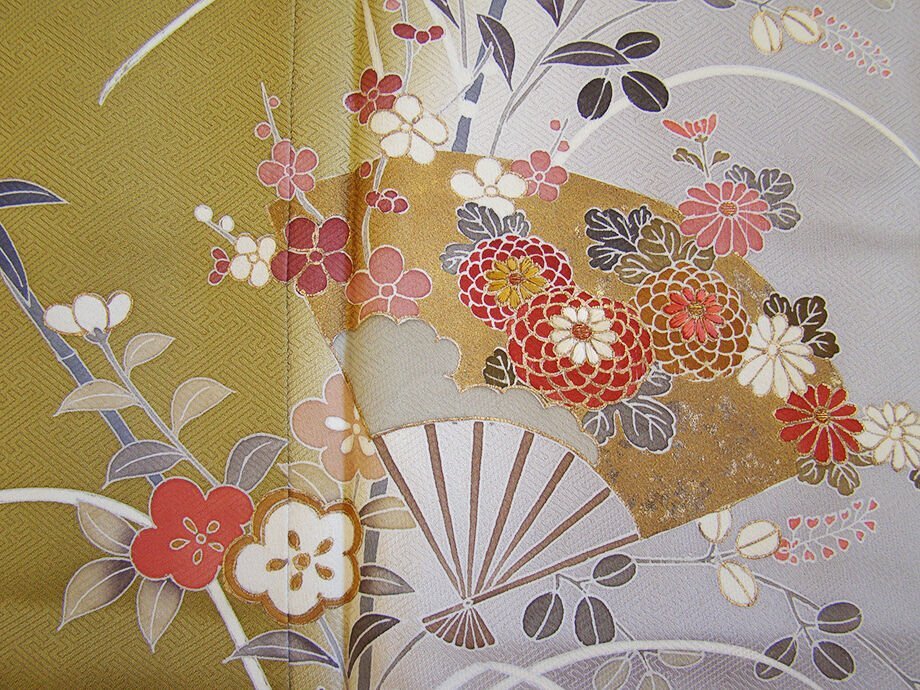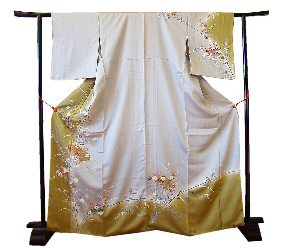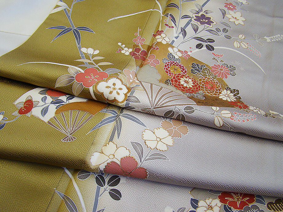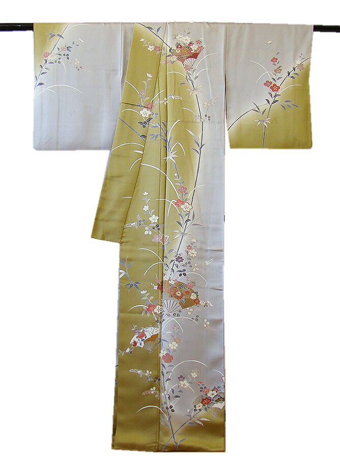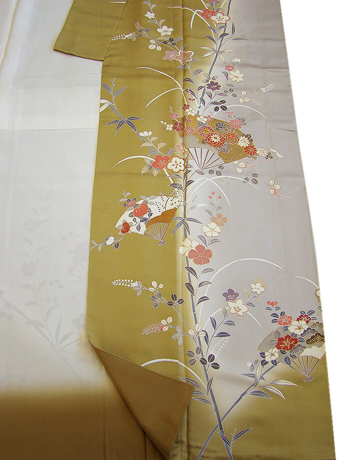 | 商品説明 | こちらのお品は「袷」ですので10月から5月までお召頂ければと思います。 しなやかで柔らかな手触り良い重厚感ある重めの紋意匠の生地、 霞色地に利休茶色ぼかし染に地模様入りに、花草、扇面柄の染柄に金彩加工仕立て、 八掛は共色(正絹)、重ね衿付き、幅広い年代の方にお召し頂けます。 |