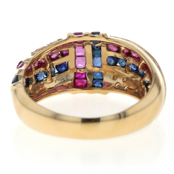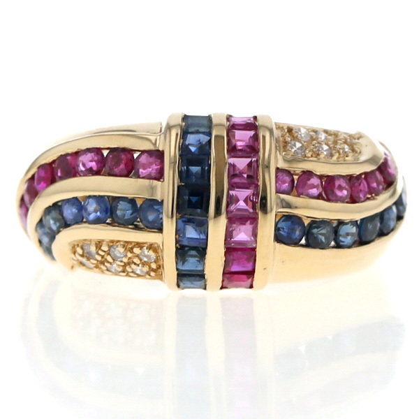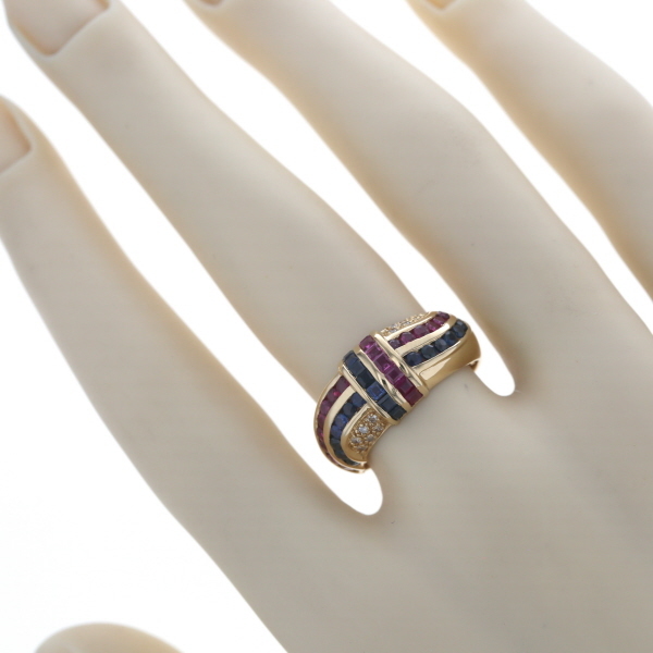 | 商品紹介 | ルビーとサファイアが二筋のラインを描き、優雅にクロスするイエローゴールドリングです。 情熱の赤と深みのある青が響き合い、そっと配された繊細なダイヤモンドが煌めきを添えています。 流れるようなフォルムが指元に動きを生み、彩りと気品を兼ね備えた印象的なデザインです。 |