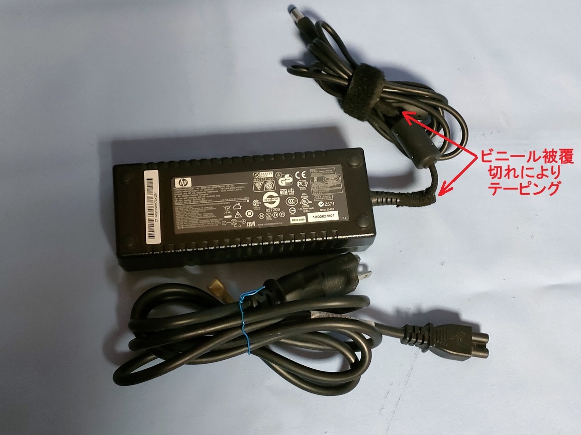 ACアダプターのビニール被覆に破れがあり、損傷部をテープ巻きしています。