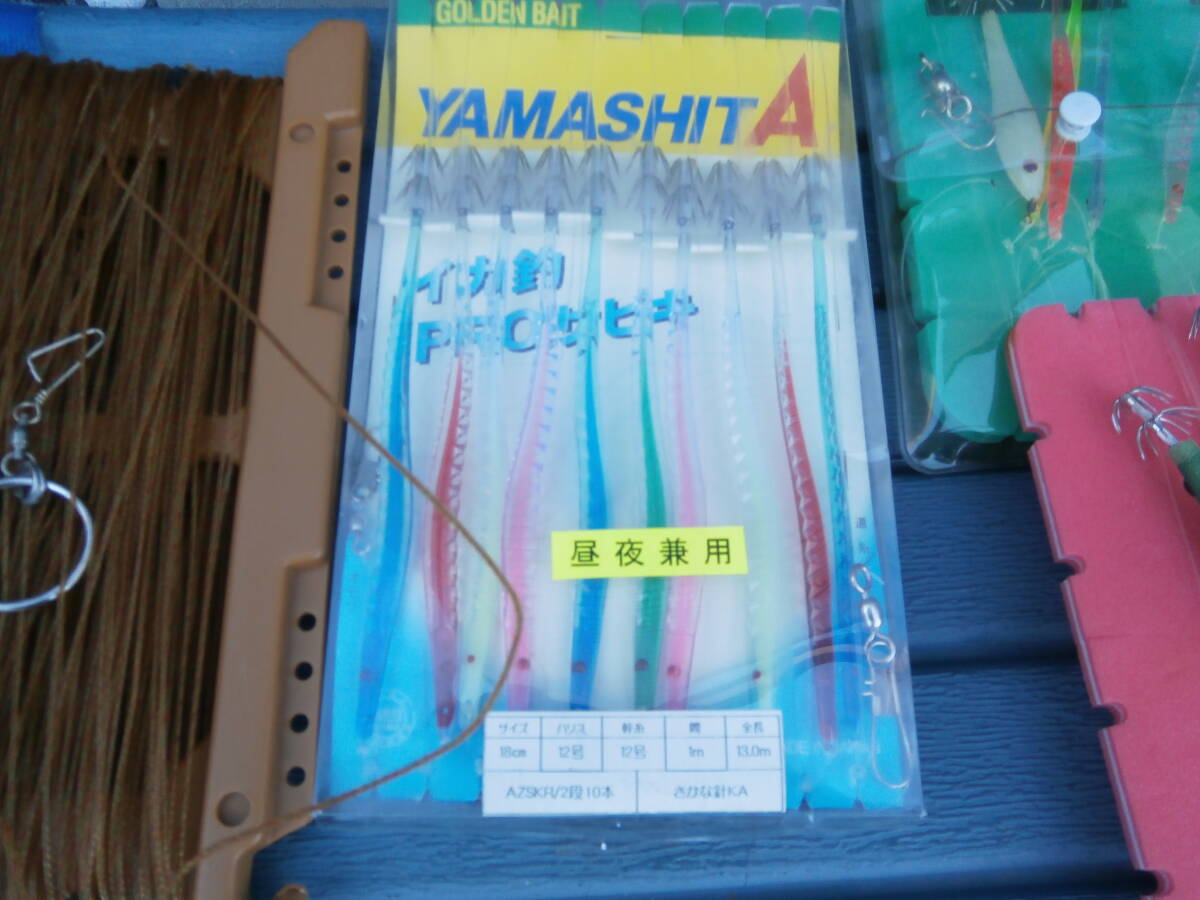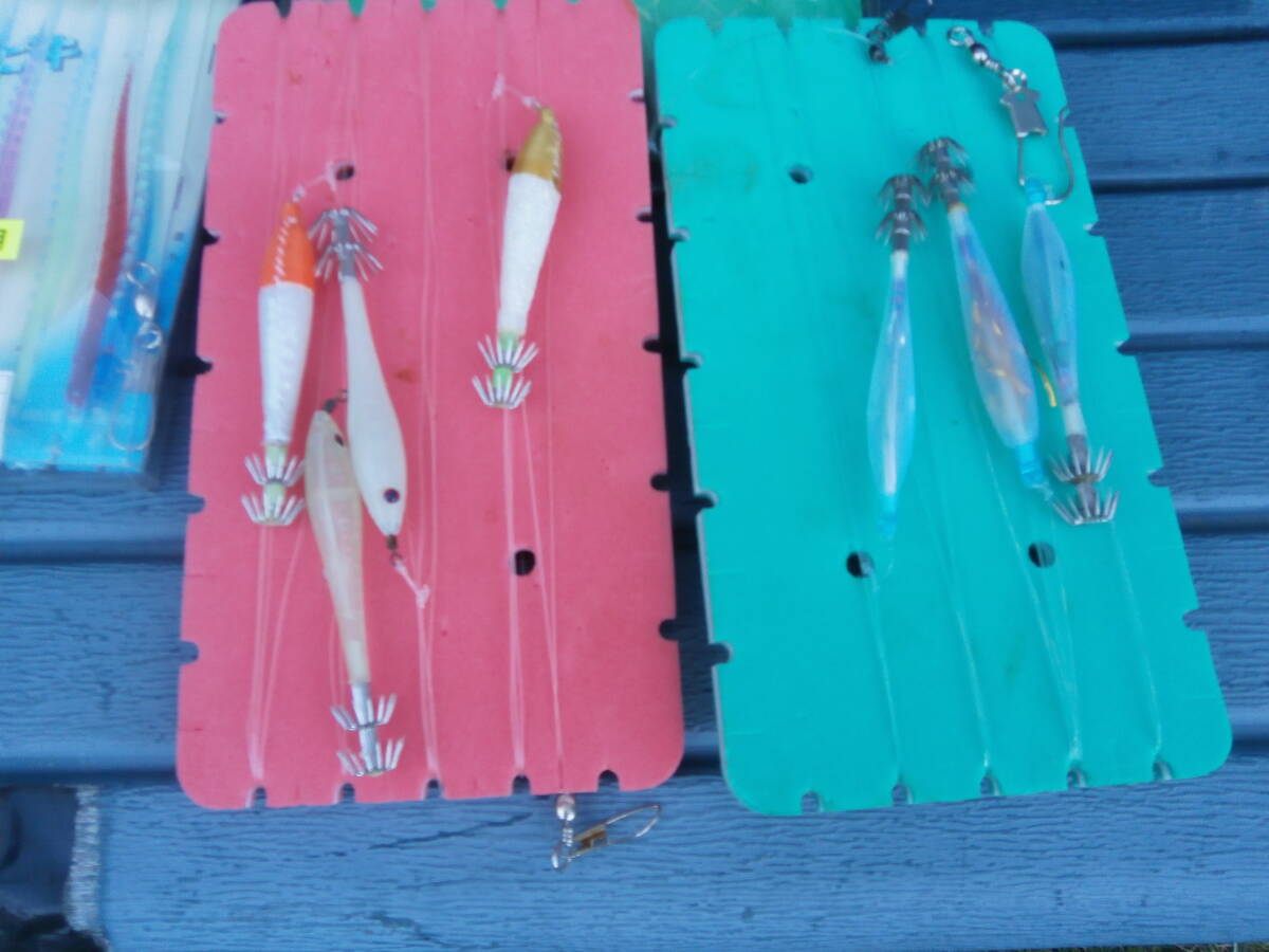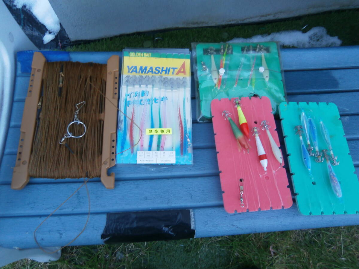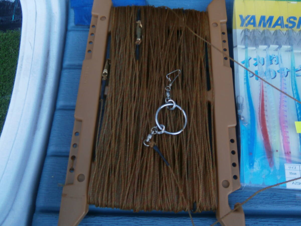 イカ釣り・仕掛け8本・12号でおっぱいスッテ2個、18cmおさかな針、11cmお魚針8本と手釣テグス35号くらいです。18㎝は未使用、テグスは10mごとにサルカンつけてます100mです。
