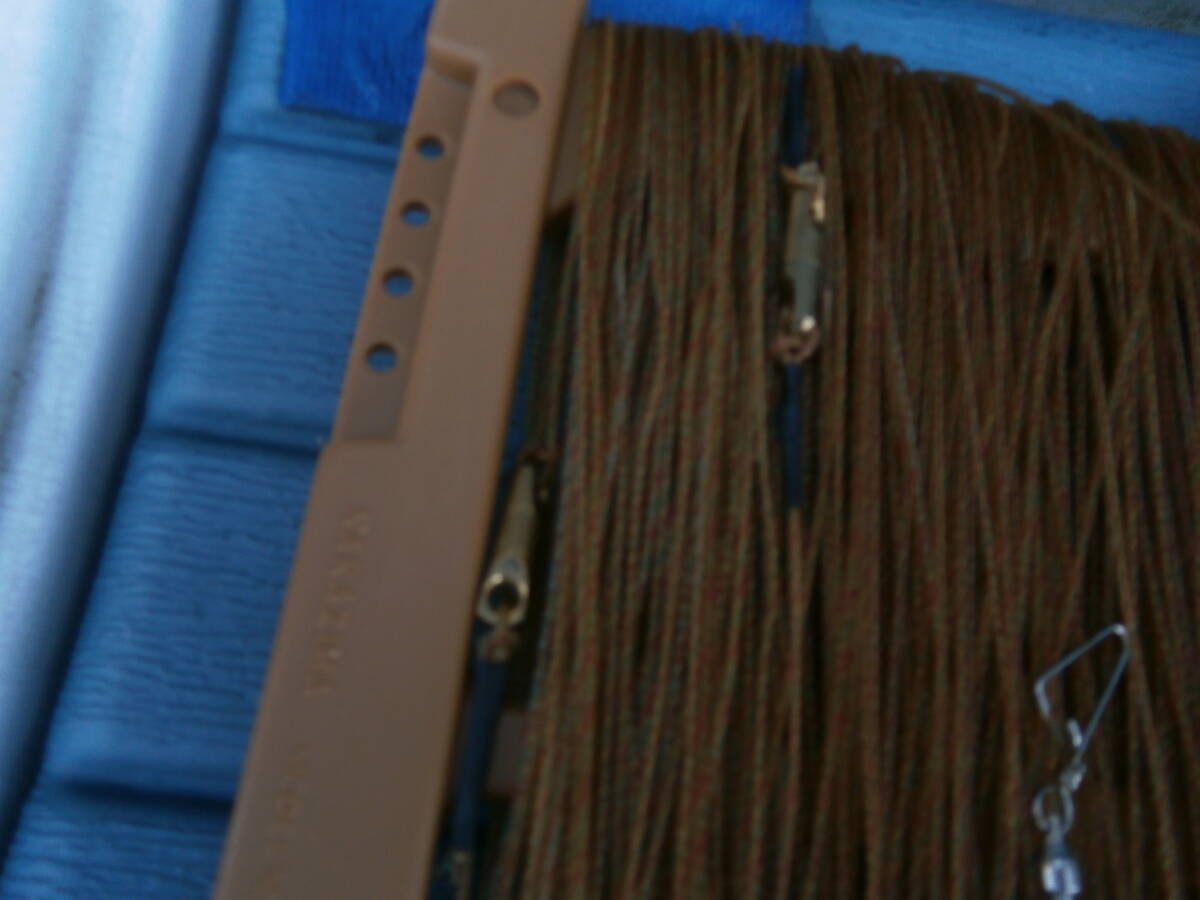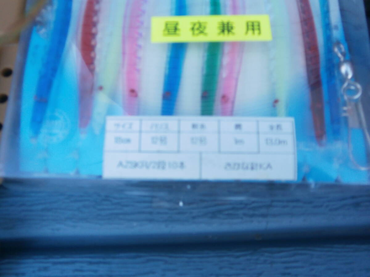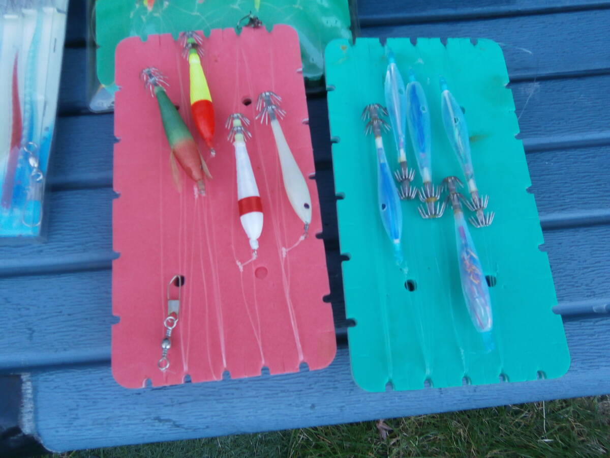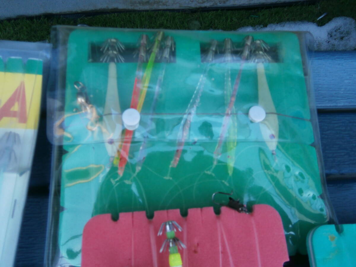 イカ釣り・仕掛け8本・12号でおっぱいスッテ2個、18cmおさかな針、11cmお魚針8本と手釣テグス35号くらいです。18㎝は未使用、テグスは10mごとにサルカンつけてます100mです。