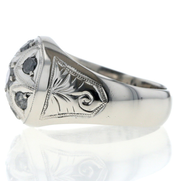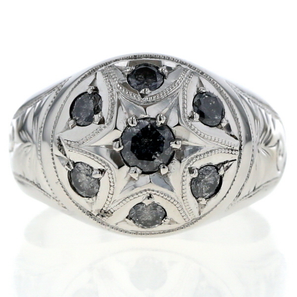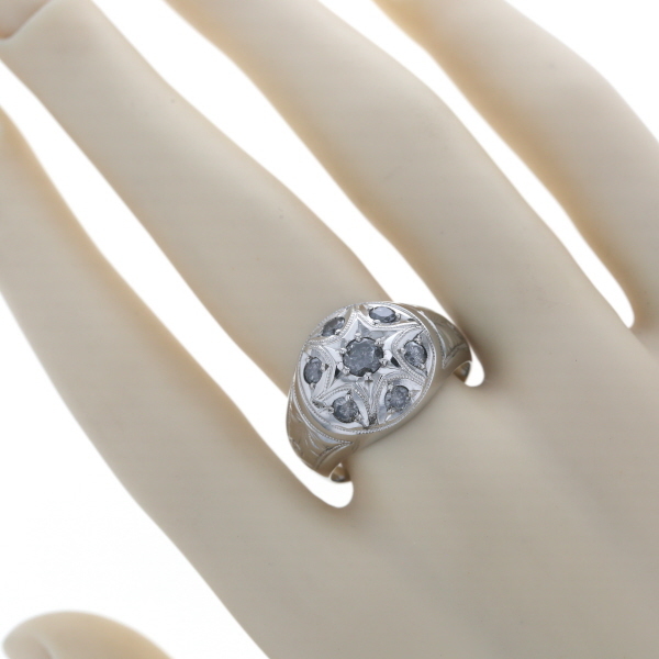 | 商品紹介 | 星モチーフとサークルが重なり合う立体的なデザインのリングです。 中央に配された一粒のブラックダイヤモンドを囲むように、プラチナの星形フレームと6粒のブラックダイヤが輝きを添えます。 艶やかな黒の輝きと金属光沢が一体となり、洗練されたモードな印象を放つ仕上がりです。 |