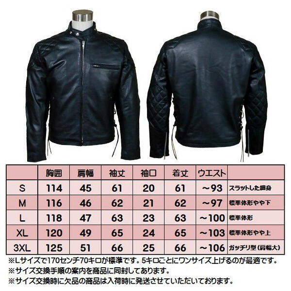 ※この価格で本牛革製、安価なスプリットレザー(半合皮)は使用して おりません。 ※長めのアームとアクションプリーツは前傾姿勢でも背中が出にくい実用的な造り、 さらに細部の仕様変更により、この価格帯では無かった高級感を出しております。 ※定番のアメリカンスタイル、大判のポケットで使い勝手良好。 ※チャックにはYKKジップ、安価でも抜かりはありません。。 ※安さのヒミツ・・・革製品は通常仕入れの2倍~5倍の利益があります。 ザワキタはコストダウン+利益ダウンで還元致します。 上記製品仕様に付きましては画像にてご確認ください。 |