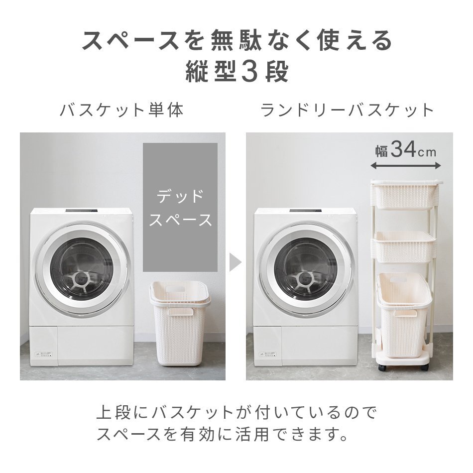 スペースを無駄なく使えるタテ型タイプです。 さらに!スリムなボディなので、コンパクトなランドリールームでも省スペースで使えます。 上段と中段の浅バスケットにはバス用品、洗濯機まわりの小物が収納できます。 入浴時の着替えや脱衣カゴとしても重宝します。 下段のバスケットは大容量の深型タイプ! 安心の耐荷重で、たくさん入れても大丈夫です。 \その他、おすすめポイント/ ・移動しやすいキャスター付 ・目隠しと通気性を兼ね備えたメッシュデザイン ・上段カゴにはタオルバー付 ・下段カゴは取り外して持ち運べる持ち手付 【商品仕様】 カラー:アイボリー サイズ:(約)34×48×97cm(組立式) 重量:(約)2.6kg 耐荷重:(約)上段20kg / 中段20kg / 下段50kg 材質:PP(ポリプロピレン) ※商品は、モニターによって色合いが異なって見える場合があります。 ※仕様・デザインは改良のため予告なく変更することがあります。 (洗濯かご 洗濯物入れ かご カゴ 洗面収納 バス用品 洗濯用品 ランドリー バスケット 小物整理 分別 サニタリー バスルーム 洗面台 かわいい 人気 おすすめ WEIMALL) |