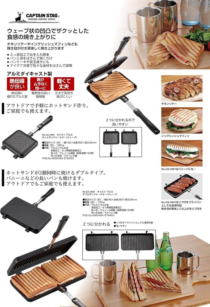 「商品状態」【新品アウトレット】※本体の外側に製造過程における白色の汚れが付着している場合がございます。製品の性能及び使用には影響はございません。☆元箱等全て揃っている新品です。在庫限りです。☆迅速に発送致しますので安心・安全にお買い物頂けます。☆迅速・丁寧に発送致します。☆最後までお読み頂きありがとうございました。 ☆We always ship quickly with domestic shipping. ☆We will ship promptly and carefully. ☆Thank you for reading to the end.「商品情報 (新品の場合) 」ホットサンドが2個同時に焼けるツインタイプのホットサンドトースターですアウトドアでもご家庭でも使えて、パンと具をはさんで焼くだけでホットサンドが作れますパンケーキにも使えますふっ素加工でお手入れも楽にできます 「主な仕様」製品サイズ:(約)幅245×全長360×厚さ35mm製品重量:(約)630g材質:本体/アルミニウム合金、表面加工/ふっ素樹脂塗膜