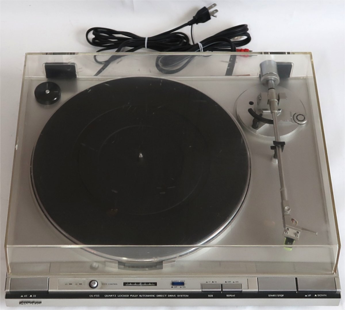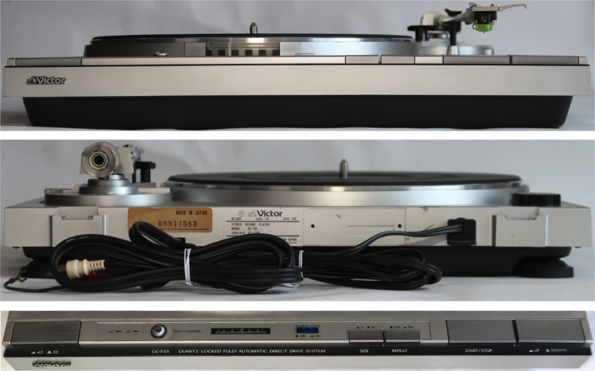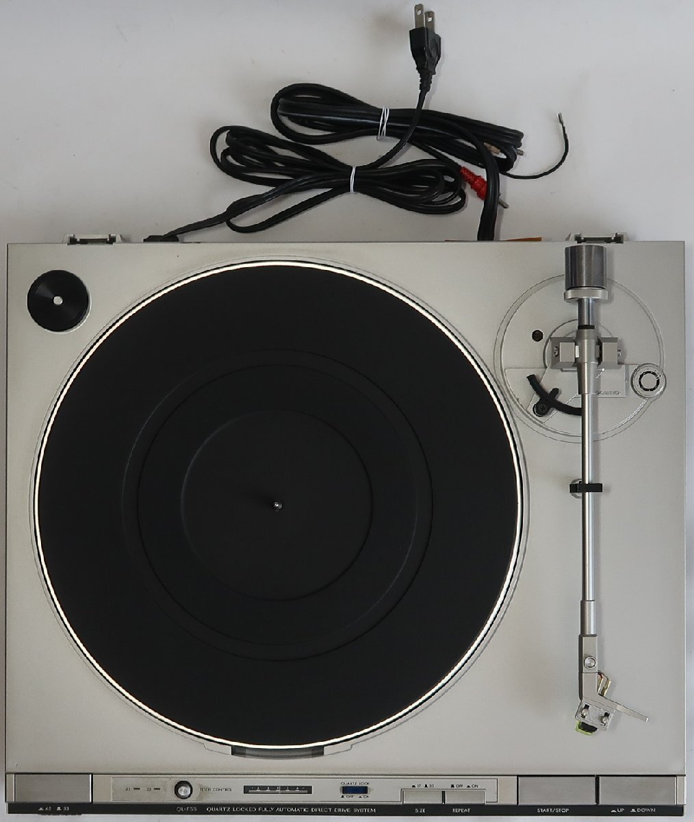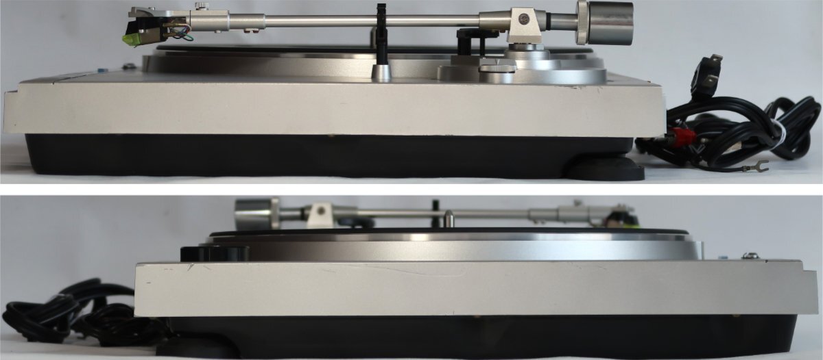 性能はネット上でお調べください。出品は画像の物のみです。天板は擦り傷やひび割れている箇所があります。私が持っている機器を用意してテストしました。30cmレコードは普通に聞けました。各部も動作しております。ただしピッチコントロールの操作をしましたが、正確に動作しているのか分かりません。操作してもあまり違いがないように感じました。17cmレコードがないのでSIZEのボタンが機能しているのか分かりません。その他のボタンの機能はしております。出品前にきちんと基本的な事は問題ないかチェックした上で出品していますが、発送後になにか説明以外の問題がありましてもサポートは出来ませんし、返品やクレームは一切受け入れられませんのでそれを納得した上で御入札下さい。