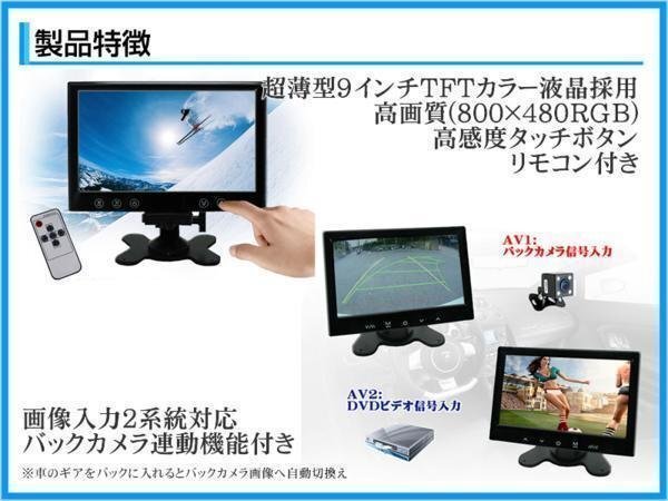 | 液晶サイズ:9インチ 画素数:800×480 消費電力:6W 映像入力端子:RCA2系統 映像入力切替機能:1系統のみバックギア連動可能 定格電圧:DC12V / DC24V 本体サイズ:横235mm × 高さ175mm × 奥行26mm |
