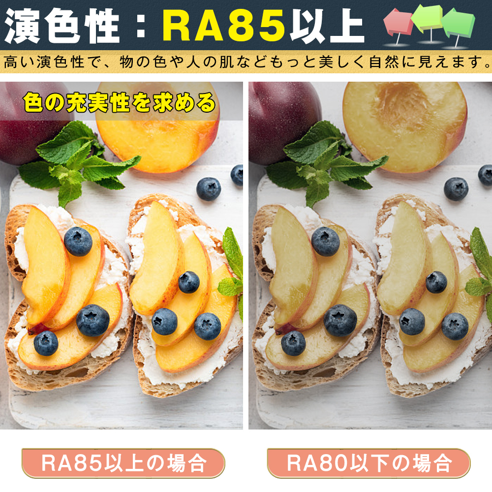 演色評価数は85Ra以上、演色性がかなり優れている。演色性は物の色の見えに影響を与え、快適な照明環境を実現するため、演色性を十分に考慮する必要があります。
