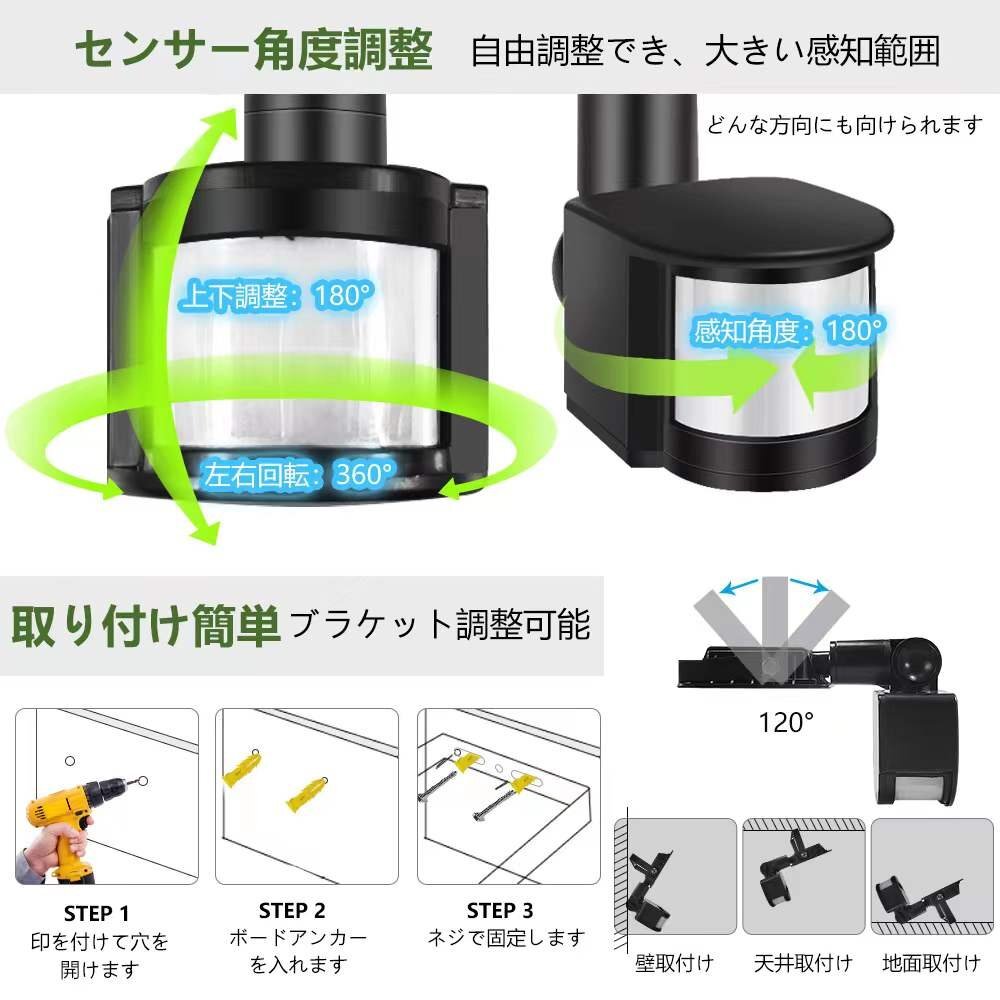 【商品詳細】 ◆センサー調整自由: センサー部は自由自在に調整できます。左右回転:360°、上下調整:180°、検知範囲:180°、感知角度がとても広いです。センサー裏面のつまみで点灯続け時間・検出距離・稼働方式も自由に調整できます。 「TIME」:ライトの点灯続け時間を3秒~10分間自由設定することができます。 「SENS」:センサーはPIR人感センサー検出器で、最大検出距離を2~10メートル自由設定することができます。 「LUX」:昼間モード:センサーが昼も夜も感応点灯します。夜間モード:センサーが夜間のみ反応します。 ◆IP66防水・省エネ: IP66防水防塵仕様で、悪天候でも耐えるように設計されて、屋根のない場所、外からの雨にさらされるような場所に設置しても安心です。高照度のランプビードが搭載されました。他のライトに比べ、同じ電源での条件下では、明るさがアップグレードし、省エネルギー効率が高くなりました。 ◆薄型で便利: 軽薄化で、コンパクトのランプなので、スペースを節約することができ、玄関、廊下、屋内、庭、倉庫、ガレンジ、家庭菜園、歩道など様々なシーンで非常に役に立ちます。そして、ライトは手間が掛かかなく、ネジで簡単に取り付けできます。 ◆長い寿命・満足保証: お客様を満足させるのはいつも私どもの主な目標です。購入日から12か月以内に故障があった場合、返品/交換は無料で行われます。製品についての質問があれば、或は故障や不具合が発生しましたら、私どもにご連絡ください、そして、こちらはすぐに応じます。 【保証】 ◆当商品は12っヶ月保証となります。 ◆お届けから1週間以内にご連絡のあった不良品の保証対応の送料は当方が負担いたします。 ◆保証期間内の不良品ですが、交換のみ対応しております。往復送料はお客様負担となります。在庫がない時だけ返金しますので、ご了承ください。 |