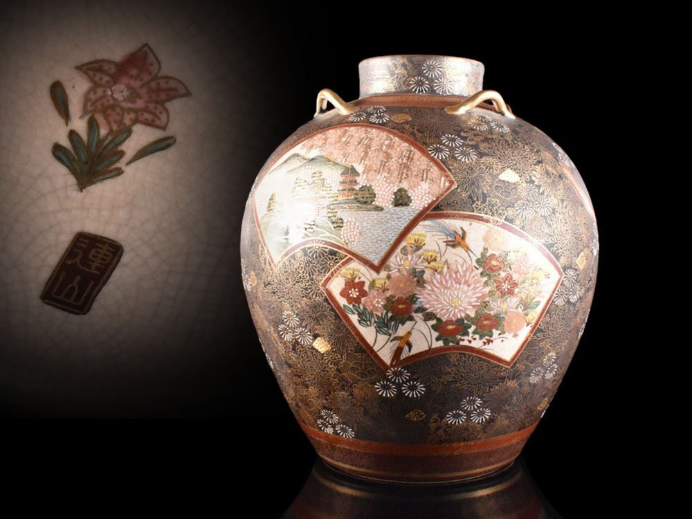 | 商品名 | 【雲】某名家買取品 豪華絢爛 薩摩連山 金襴手花尽扇窓絵楼閣山水文四耳大花瓶 高さ34cm 古美術品(壺花器花入)CY2231 UThnbsm |