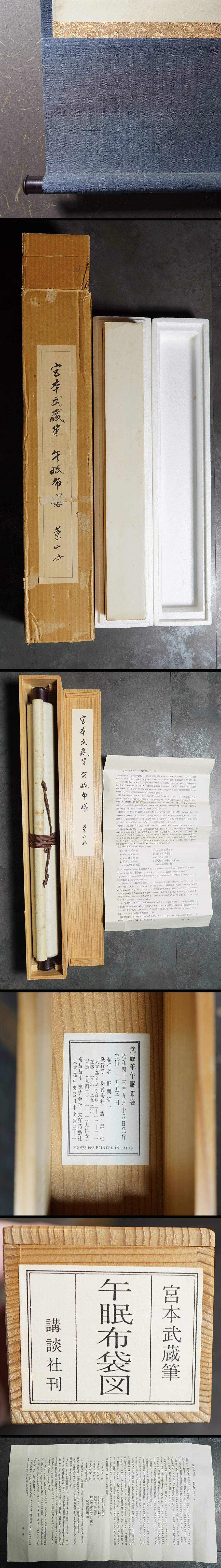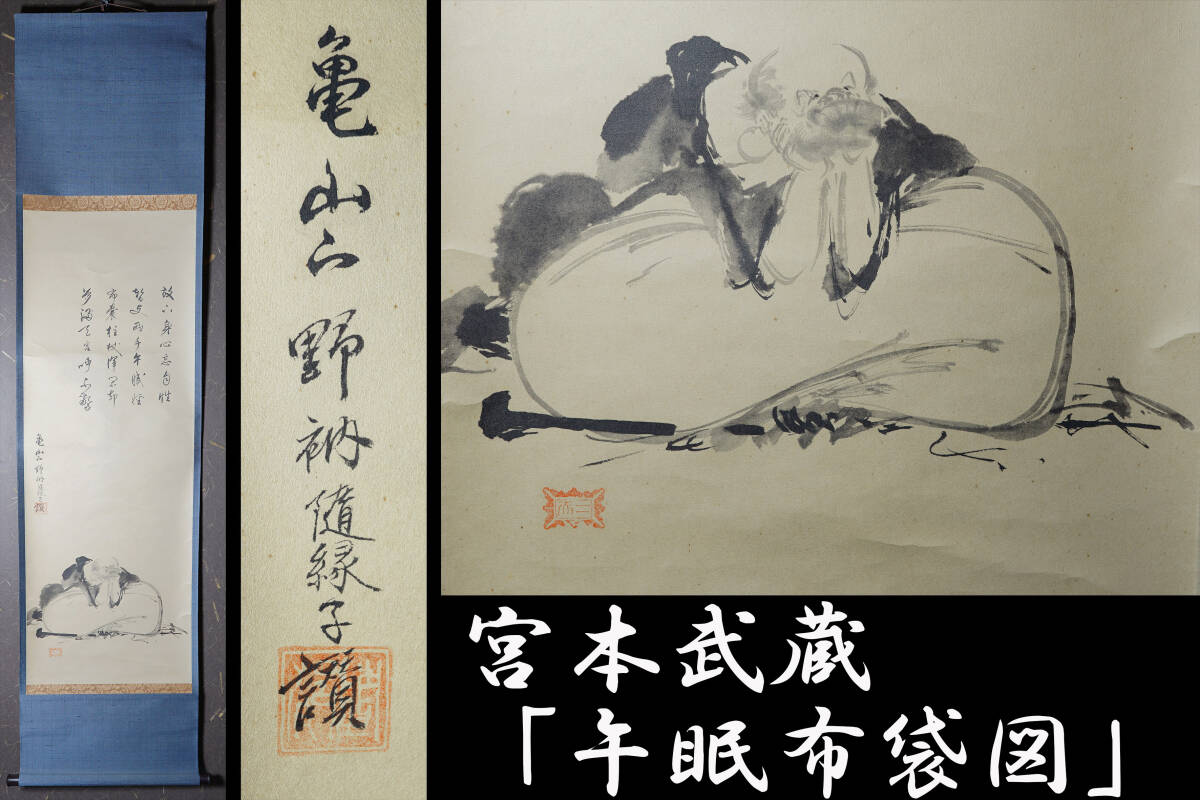 【サイズ】:表具が縦 175cm、横 41cm 本紙が縦 108cm、横 38cm 【本紙】:紙本。工藝版画。 【 箱 】:箱あり。 【状態】:表具は良好です。折れ、小シミがあります。 小説「宮本武蔵」の出版を記念して講談社から頒布された作品。 武蔵の剣禅一致の精神を顕す名品として伝来した作品。 「動」と「静」の「静」の精神を説く、この作品を説くヒントは京都天龍寺の文礼周郁の讃文にある。 自身の心を無にしてそしてまるでそこにないものかのように自身を消して大きな声で呼びかけても驚きはしない。 布袋は寝てるのかはたまた覚醒しつつ空間と一体となっているのか 解説書付き |