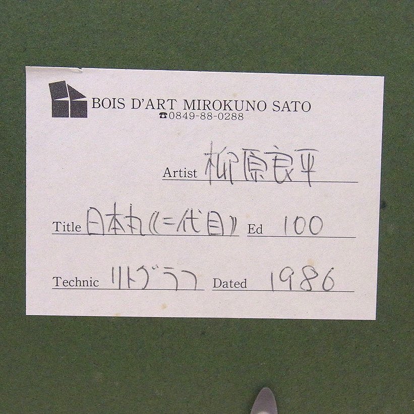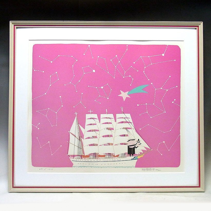 柳原良平 1986年制作 リトグラフ 二代目 日本丸 オリジナル額でございます。 【柳原良平】 1954年、京都市立美術大学(現・京都市立芸術大学)工芸科図案専攻卒業。 柳原の描いたCMキャラクターの「アンクルトリス」が人気となり 毎日産業デザイン賞、広告電通賞などを受賞。 1977年 第26回横浜文化賞を受賞。 1987年 運輸大臣賞を受賞。 1990年 第37回運輸省交通文化賞を受賞。 商船三井、佐渡汽船、太平洋フェリー、東海汽船の海運各社から名誉船長の称号を贈られている。 出品のお品は大切に扱われておりましたので至って良好な状態です。 販売当初のオリジナル額装の状態ですが、小傷や裏紙の痛みが見られます。(最後写真参考) ガラスは紫外線カットアクリルに交換してありますが、アクリル特有の磨き傷が見られます。 経年保管のお品ですので、保管に伴う経年変化はご理解ください。 作中に「柳原良平Ryo」の直筆サインを確認致しました。 お品寸約 額寸 81.7×71.8cm 絵寸 65.5×55cmでございます。 お品は保障させていただきますので、レブリカや贋作の類だった場合や 説明と違う状態だった場合は返品はもちろん、送料や振込み手数料を当店で 負担させていただきます。 どうぞ宜しくお願い致します。 ※出品者の齊藤商店は創業75年の美術商です。ホームページは【こちら】をご覧ください。(外部サイト) 他にもいろいろと出品しておりますので下記バナーをご覧下さいませ。 ![]() |