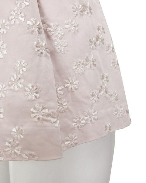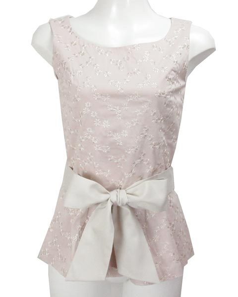 | ハリのある生地にのフェミニンなトップス。光沢のあるお花刺繍が全体に入っていて、華やかな雰囲気。薄いピンクなので甘くなりすぎません。付属のリボンのオンオフで、2WAYの雰囲気が楽しめます。カジュアルにもキレイ目にも使えるトップスです。 |