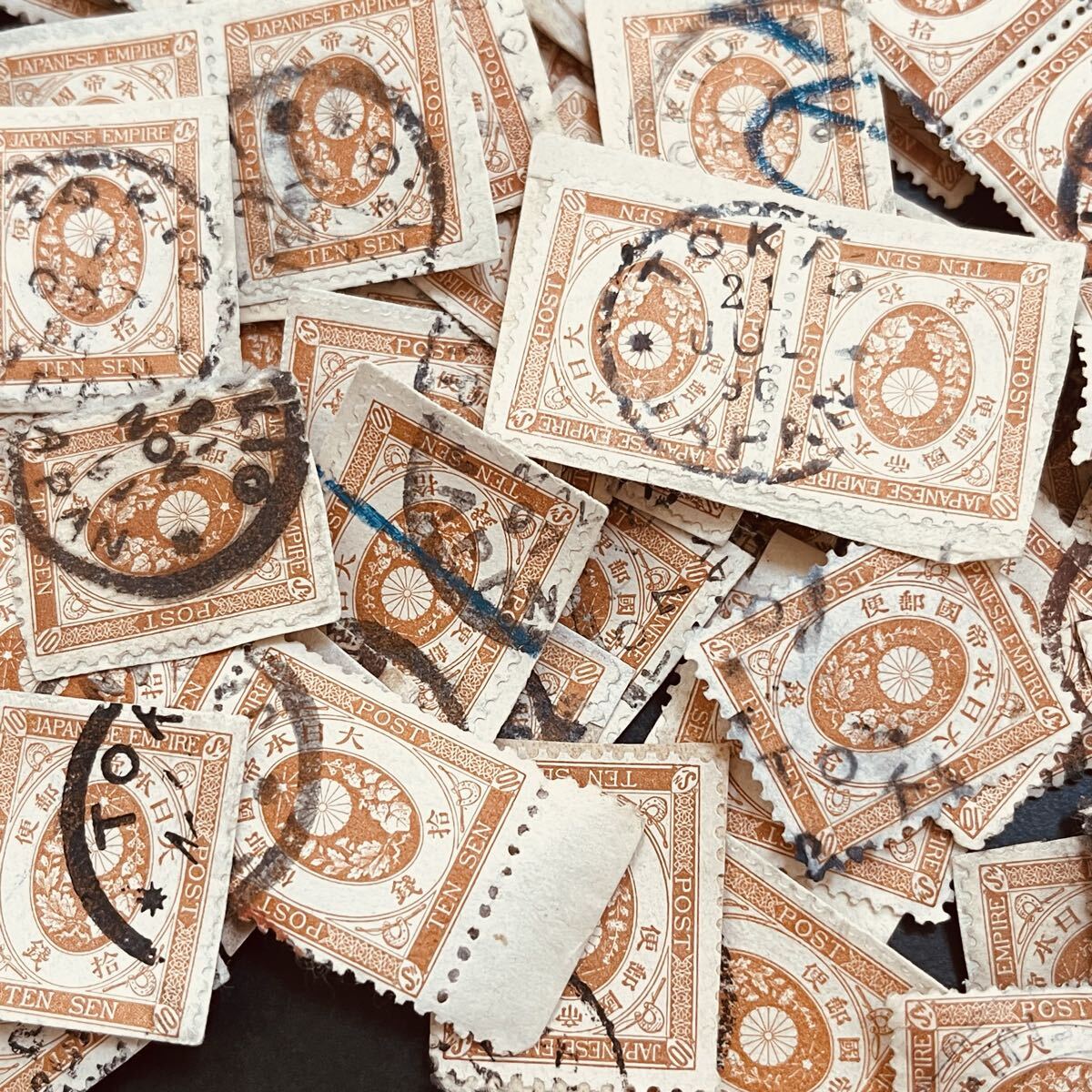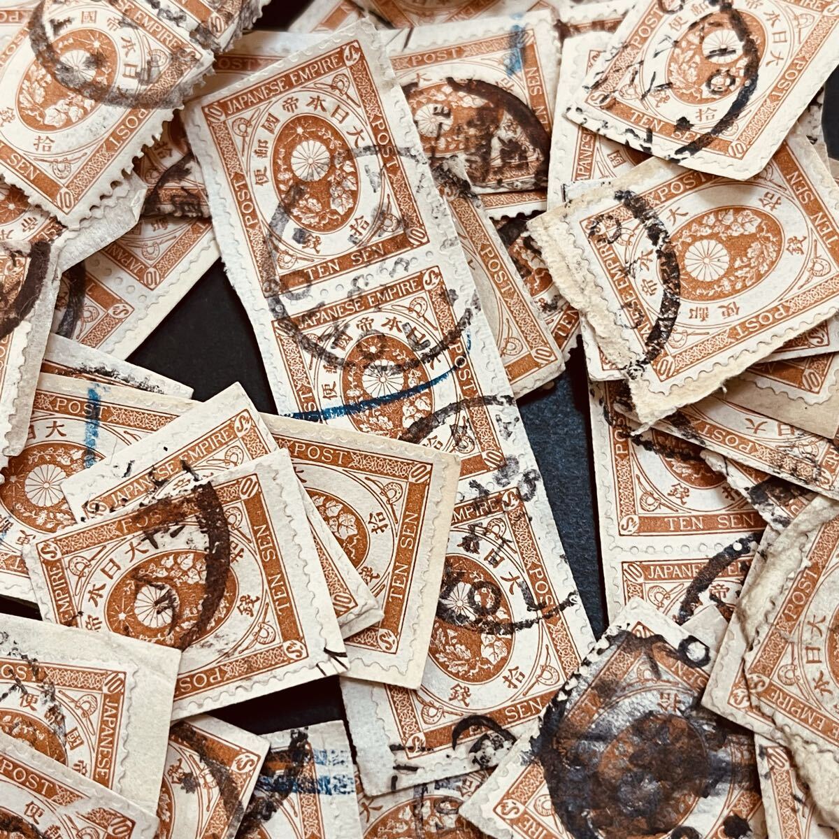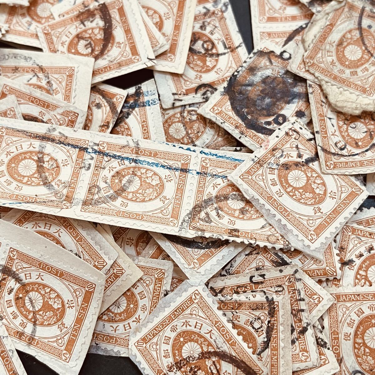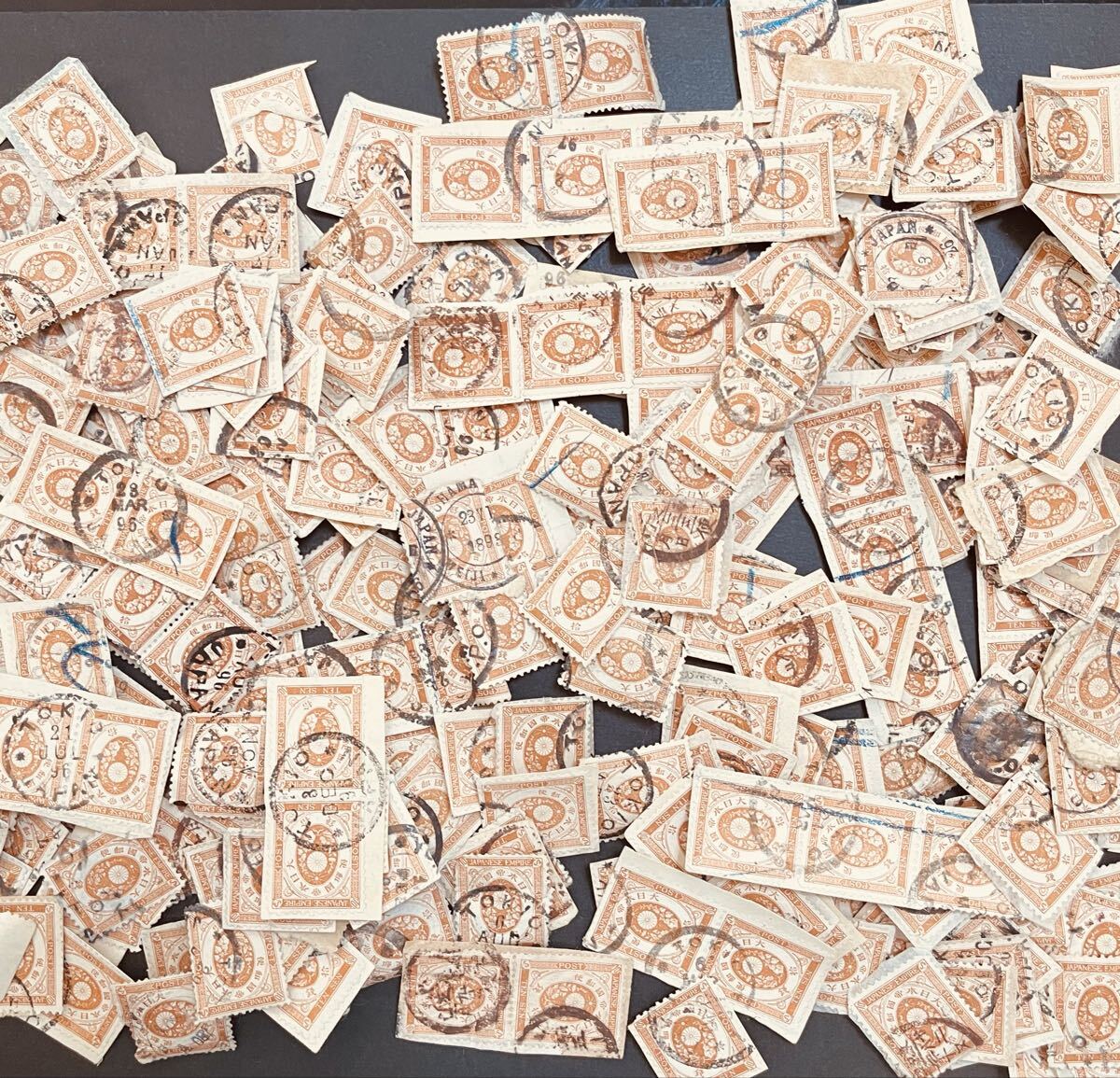 里帰りオンペーパーロット。古い時代に輸出されたものと見られる。大型封から切り取られたものの模様。大半が欧文印。オンペーパー中心だが紙から剥がしたものも含む。状態混合。