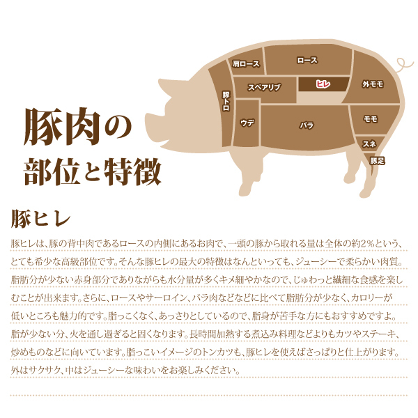 ホエイ豚:牛乳からチーズを作る時に副産物としてできる"ホエイ(乳清)"を飲ませて育てた豚。風味のよさ、やわらかさが特徴です。 豚ヒレは、豚の背中肉であるロースの内側にあるお肉で、一頭の豚から取れる量は全体の約2%という、とても希少な高級部位です。そんな豚ヒレの最大の特徴はなんといっても、ジューシーで柔らかい肉質。 脂肪分が少ない赤身部分でありながらも水分量が多くキメ細やかなので、じゅわっと繊細な食感を楽しむことが出来ます。さらに、ロースやサーロイン、バラ肉などなどに比べて脂肪分が少なく、カロリーが低いところも魅力的です。脂っこくなく、あっさりとしているので、脂身が苦手な方にもおすすめですよ。 脂が少ない分、火を通し過ぎると固くなります。長時間加熱する煮込み料理などよりもカツやステーキ、炒めものなどに向いています。脂っこいイメージのトンカツも、豚ヒレを使えばさっぱりと仕上がります。外はサクサク、中はジューシーな味わいをお楽しみください。 ※重量にばらつきがございます。ご了承いただける方のみご入札下さい。 |
