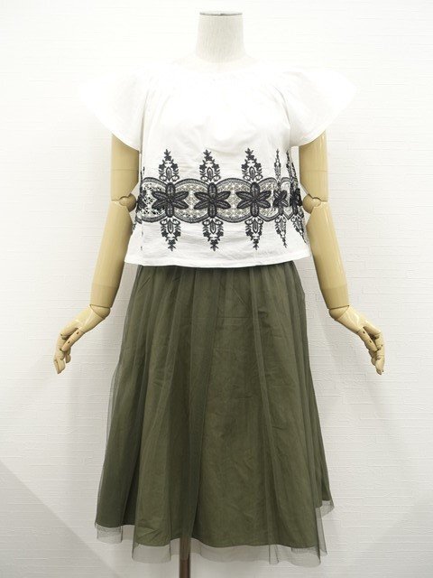 半袖プルオーバーブラウス+ロング丈レースチュールフレアスカート コーディネート上下2点セット M相当 ホワイト ブラック 花柄刺しゅう/グリーンカーキ ガーリー・フェミニン系 20代
