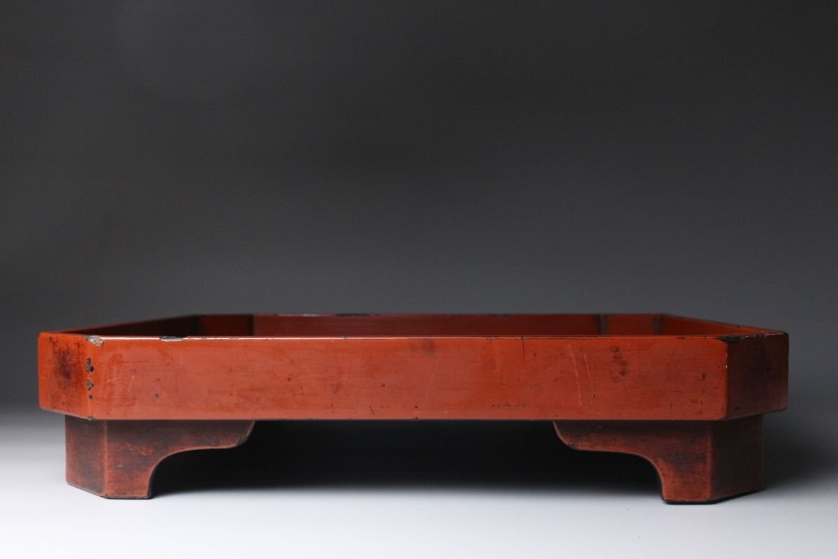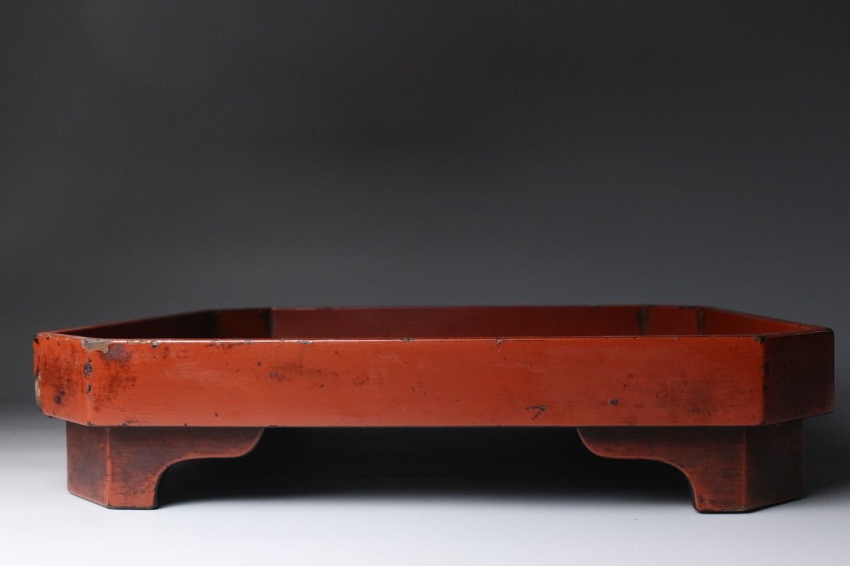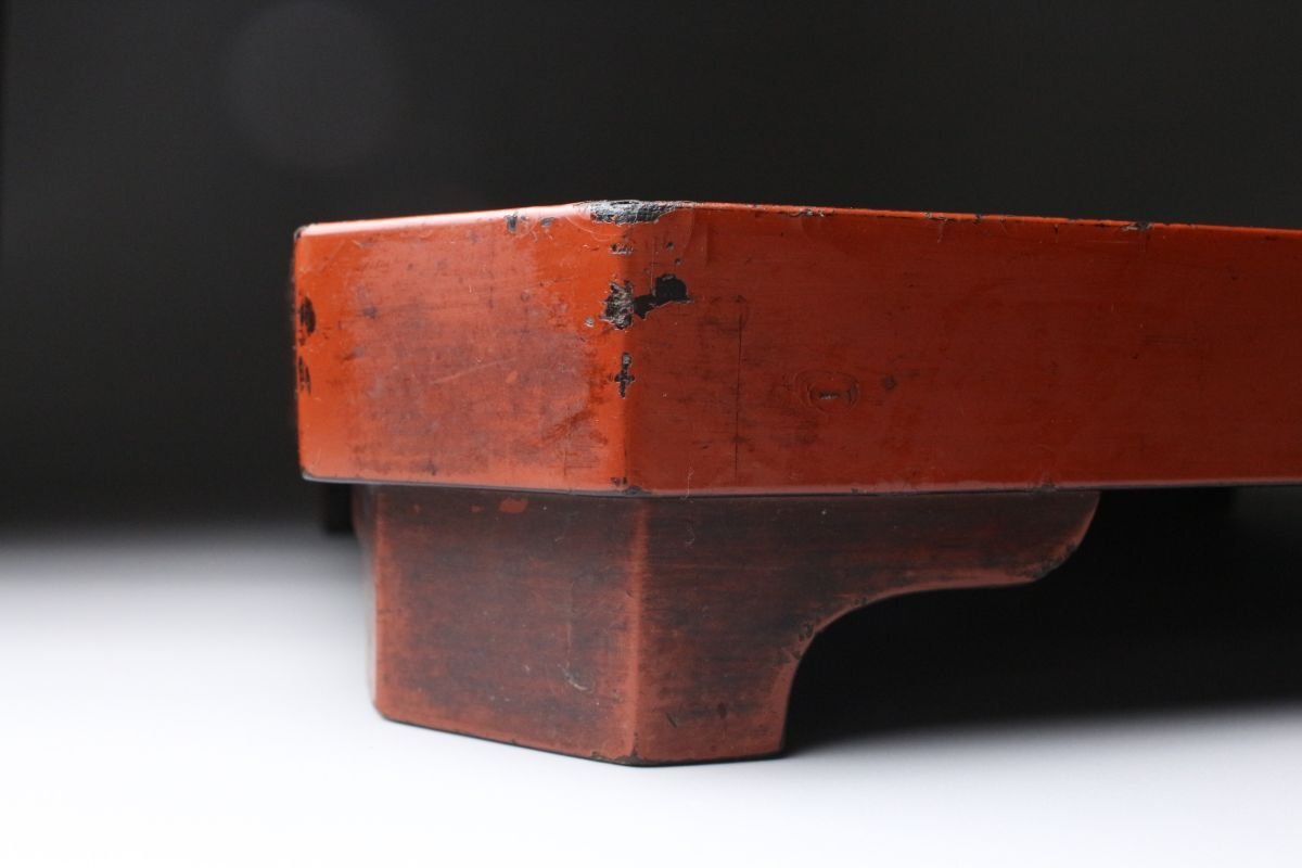 ①[.-O]25.10 251017F24 T* * * 商品詳細 * * * ここでしか出逢うことのできない唯一の美をご紹介させて頂きます。 長い歳月を経てなお、静かに美しさを湛える「時代 古根来 木製漆塗 隅切四方盆」。 時代を重ねるごとに深みを増した漆の艶、擦れや色の変化が、 この盆の歩んできた歴史を物語っています。 漆の赤味は年月とともに落ち着きを帯び、使用によるスレが下地の黒をわずかに覗かせます。 使い込まれた木地の風合は手に触れるたびにしっとりとした温もりを感じさせ 「わび・さび」を見事に表現しています。 お茶席の道具としてはもちろん、現代の空間にも調和する逸品。 経年の味わいを愉しみながら、悠久の時を感じさせる一枚です。 この機会に是非お手元にてご堪能ください。 ■サイズ/横36.5㎝×高7.5㎝ ■状態/ 経年によるスレ、傷、汚れ、ヒビ、割れ、欠け、剥がれがございます。 ※写真にてご確認、ご了承の上ご入札下さい。