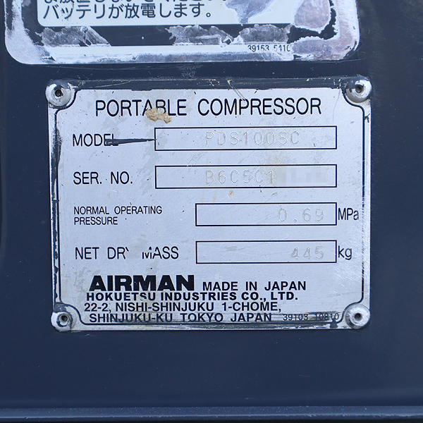 | ■メーカー : AIRMAN(北越工業) ■型 式 : PDS100SC-5C1 ■寸 法 LWH[mm] : 1,460×750×865 ■本体乾燥質量 [kg] : 435 ■整備質量 [kg] : 475 コンプレッサ ■型 式 : スクリュ回転形1段圧縮油冷式 ■空気量 [m3/min] : 2.8 ■吐出圧力 [MPa(kgf/cm2)] : 0.69(7.0) ■コンプレッサオイル量 [L] : 11 ■レシーバタンク容量 [L] : 20 ■サービスエア温度(目安) : 大気温+20℃ ■サービスエアバルブサイズ×数量 : 20A×2ケ ディーゼルエンジン ■エンジン名称 : シバウラS773L-D ■型 式 : 水冷4サイクル3気筒渦流室式 ■エンジン定格出力 [kW(PS)/min-1] : 19(28.5)/3,500 ■使用燃料 / タンク容量 [L] : 軽油 / 28 |