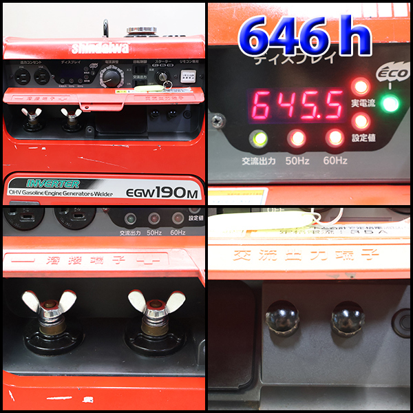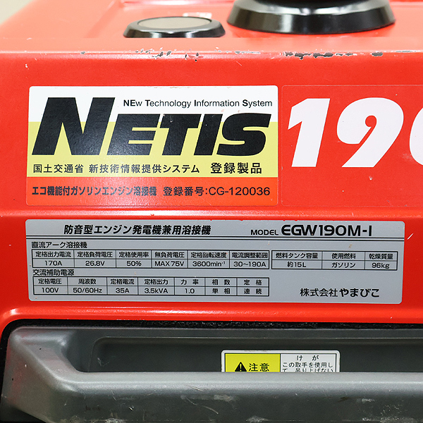■メーカー : shindaiwa(新ダイワ) ■型 式 : EGW190M-I ■寸 法 LWH[mm] : 730×545×647 ■乾燥質量 [kg] : 96 直流溶接電源 ■定格電流 [A] : 170 ■電流調整範囲 [A] : 30~190 ■定格使用率 [%] : 50 ■適用溶接棒 [mm] : Φ2.0~4.0 交流電源 ■周波数 [Hz] : 50/60 ■定格出力 [kVA] : 3.5 ■定格電圧 [V] : 100 ■定格電流 [A] : 35 ■エンジン名称 : ヤマハ MZ360 ■始動方式 : セル式(リコイルスタータ式) ■機関形式 : 空冷4サイクルガソリン(OHV方式) ■定格出力 [kW] : 7.1 ■定格回転速度 [min-1] : 3,600 ■総排気量 [L] : 0.357 ■使用燃料 / タンク容量 [L] : 無鉛ガソリン / 15 ■溶接 燃料消費量 [L/h] : 1.67 ※定格負荷、使用率50%時 ■発電 燃料消費量 [L/h] : 2.42 ※単相定格負荷時 ■騒音値 [dB(A)/7m] : 60 ■メーカー希望価格 : ¥781,000(税別) |