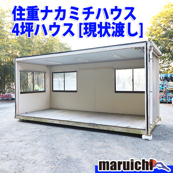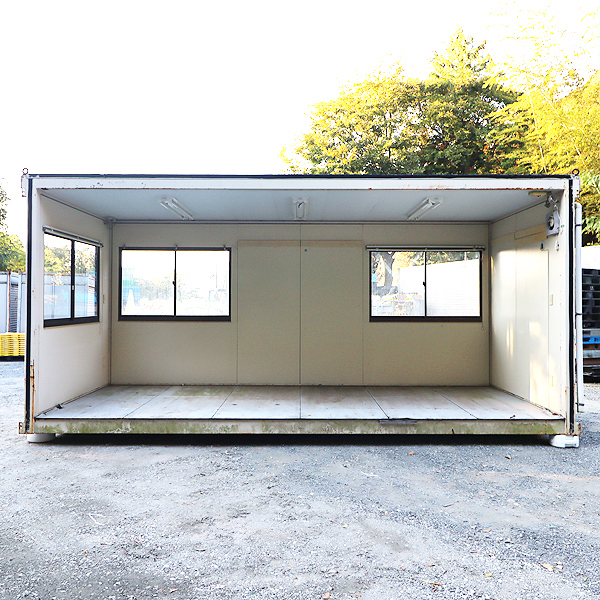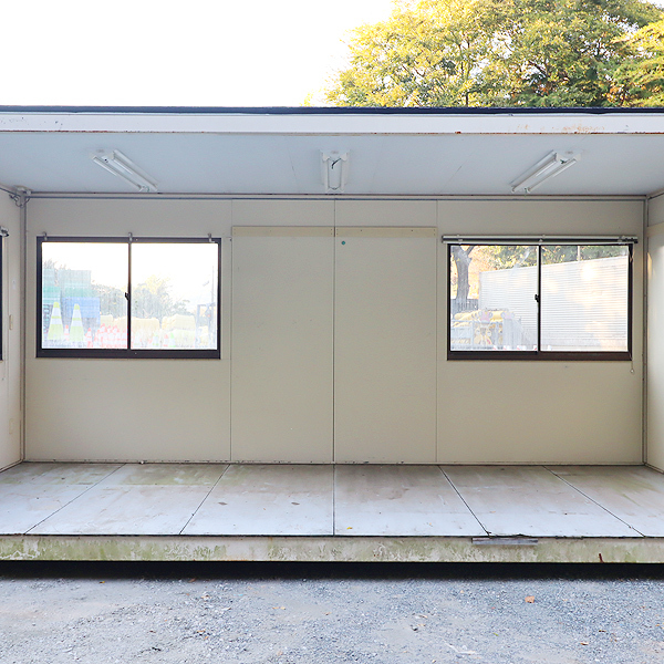 ■メーカー : 住重ナカミチハウス ■フレーム寸法 LWH[mm] : 5,600×2,300×2,650 ■外形寸法 LWH[mm] : 5,820×2,300×2,720 ■重 量 [kg] : 約1,350 ■床面積 [坪] : 約4 ■室内高 [mm] : 2,350 ※四面のうち一面に壁がないのは連棟型(連結仕様)のためであり、欠損ではありません。 ※標準4tトラックでは幅が足りないため、側アオリが閉まりません。 |