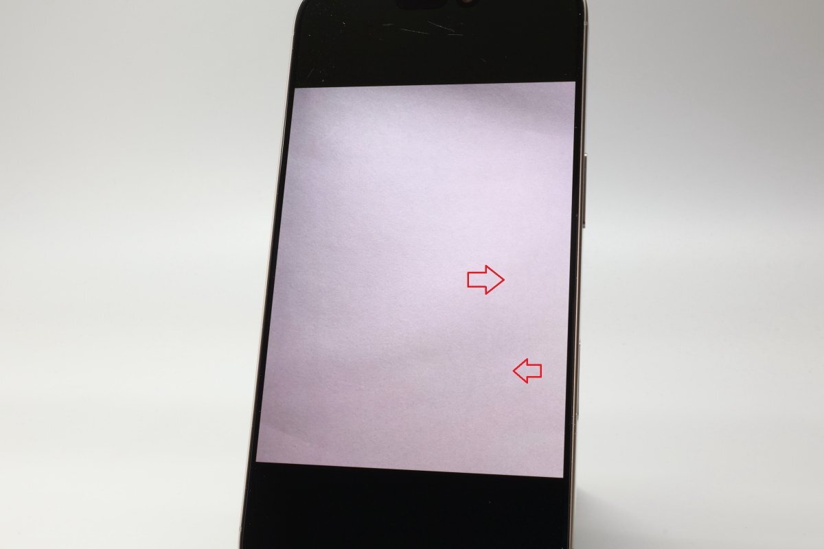 ・インカメラ撮影時、写真ともに縦(赤矢印)に光のラインが写り込みます(写真6 ※インカメラで撮影した写真を撮影してます)