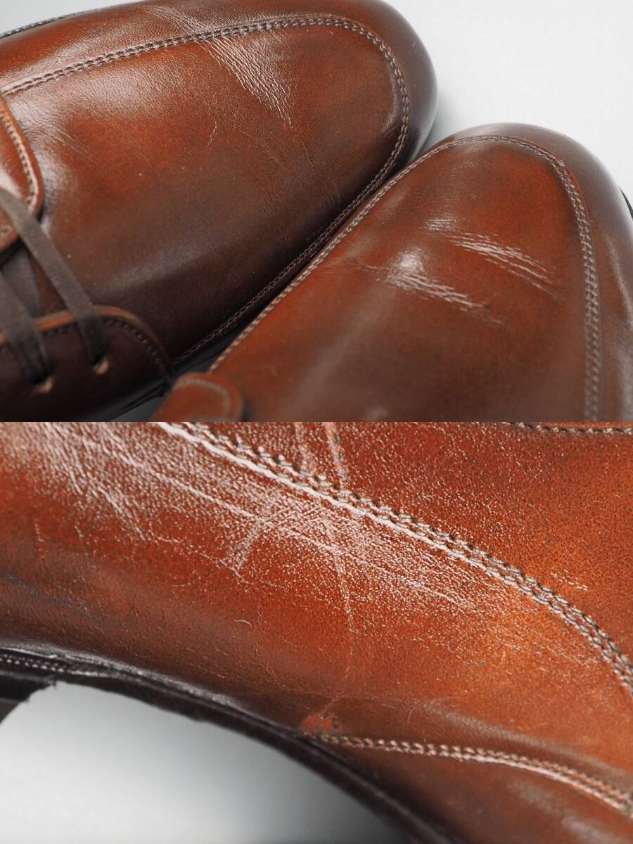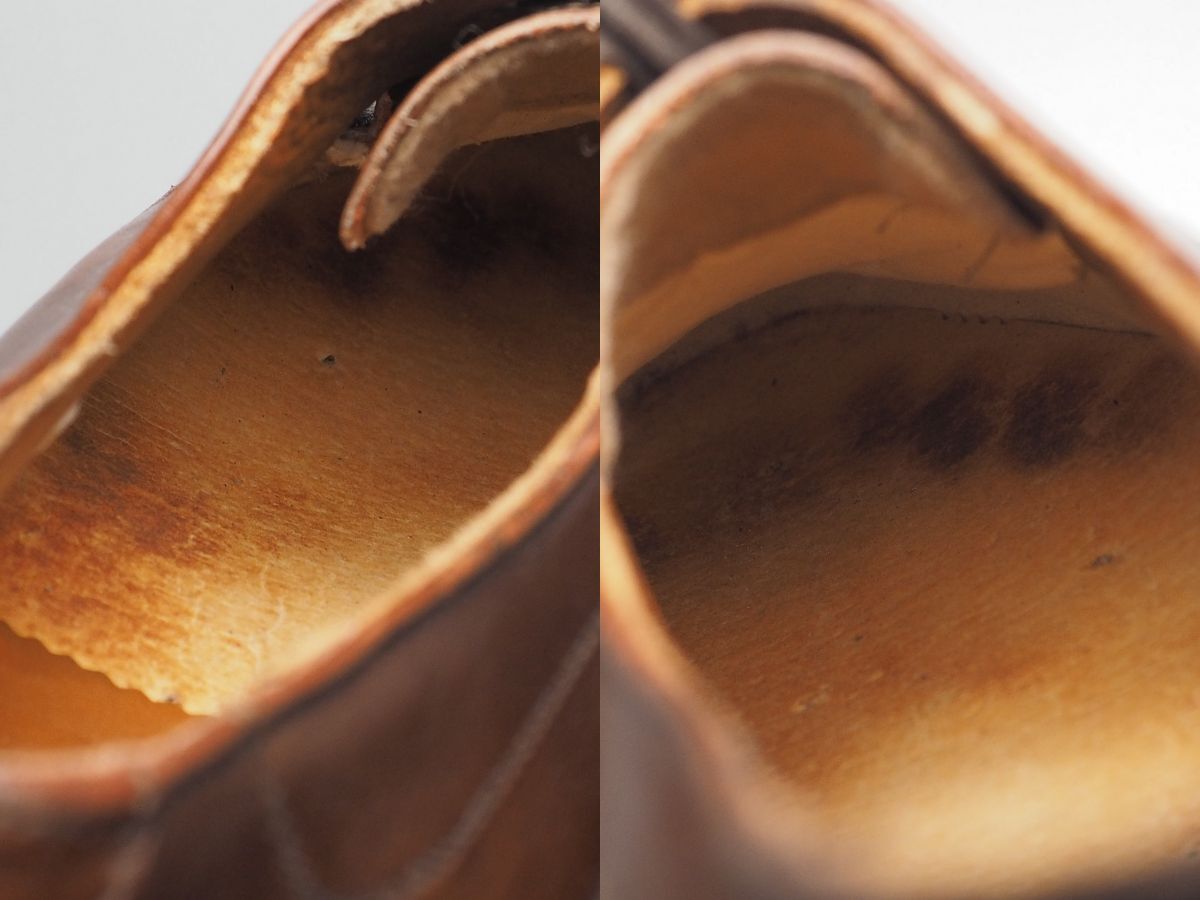 【コンディション詳細】 アッパーのシワ、所々の擦れキズや汚れ、色ムラ、またインソールの汚れやシミが見られますが、その他支障になるようなダメージ等はなくこれからも十分にご愛用いただけるコンディションです。 アウトソールの減りはトゥで2mm程度、ヒールで1mm程度です。 |