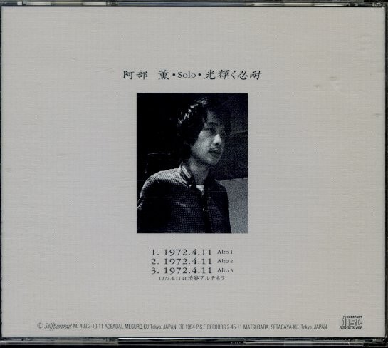 1994年発売。1972年、阿部薫23歳当時の渋谷プルチネラでのアルトサックス・ソロ!若く瑞々しさのある素晴らしい演奏。//国内盤 P.S.F. Records CD