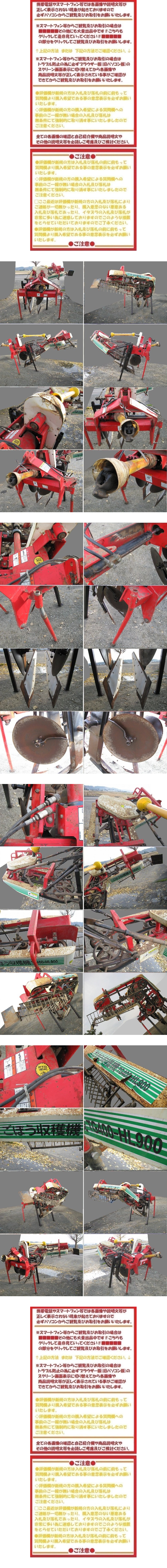 ★苫米地技研工業 ごぼう収穫機 TG400-HL900 の出品です。 ■本体外寸 奥行 約2880㎜ × 横幅 約2150㎜ × 高さ 約1900㎜ (画像1の状態にて) ●スケルにて計測していますので絶対値ではありません。 (ジョイント&各部各所の最大張り出し部分を含んでおります。)【※地形の都合により高さの寸法は異なります。】 ■重量:不明 ★機体が大きい為に発送や陸送は当方側ではいたしておりません。入金先払いにて引き渡し限定のみのお取引となります。 ■現物確認可能です。現物確認希望の場合は『苫米地技研 ごぼう収穫機 TG400-HL900』と 記入し見学者情報等(お名前・住所・電話番号・ヤフーID等)をこちらのアドレスへ⇒bokudesu2010@yahoo.co.jp ※必ず見学者情報等(お名前・住所・電話番号・ヤフーID等)の具体的な詳細をお知らせください。 お名前・住所・電話番号・ヤフーID等の不足情報等がひとつでもある場合は大変申し訳ございませんが一切ご返答いたしません。 ●入札及び落札する前に現物確認を強く希望いたします。 青森県の十和田市出品管理となりますが保管場所は県南のお隣りの市町村となります。現物確認歓迎です!!! ●前所有者さんの方から譲られました。 ●定番な機種ですが売切ります。 ★機体が大きい為に発送や陸送は当方側ではいたしておりません。入金先払いにて引き渡し限定のみのお取引となりこちら青森県の県南へ引き取りに来ていただきます。 ●落札者様のトラックの荷台が平ボディーの幌無し(コンテナや屋根や囲いが無いタイプ)でこちらへお越しいただければ当方の2tのクレーン付きのトラックで積み荷はいたします。 ●近隣地域の方は直接トラクター等でお越しになって接続及び取付してお持ち帰りも可能です。 ●直接引取りに来られる場合は落札後は1ヵ月以内に引き取りに来られる方のみとさせていただきますのであらかじめご了承ください。 ●落札後1ヵ月以内に引き取りに来られない場合は1ヵ月を過ぎた場合に翌日から1日経過するたびに1日1000円を別途ペナルティーとして1日ごとに徴収いたします。 ★入札及び落札する前に現物確認も可能ですので是非よろしくお願いいたします。 ★前所有者さんからの直送品の為に未清掃品となっております。 ●前所有者さんの方が離農に伴い今後使用する機会がない為に急遽譲られたものとなります。 ■キズ&サビ&汚れ&使用感等が見えます。 ★当方農家さんではありませんので、引き取り後に実際にごぼう畑での実演チェック等は一切しておりません。 ●一応は当方で油圧系以外となりますがジョイントをトラクターへ接続しPTOを回してみて各ベルトの動作のみは目視にて確認済みです。実際にごぼうの収穫はしておりません。 ●油圧の部分は外部油圧が接続できるトラクターを所有していない為に油圧作動の良し悪しやオイル漏れがあるかないかの状況は今現在は不明となっております。 ●刃先や刃先付近に装着されている白色の樹脂板にはそれなりにそれぞれに使用感や痛み等が見えます。 ●各画像には詳しくは写っておりませんがヘコミや曲がり等が見える部分があります。 ●譲られたものですので各パーツ類にはヘコミや曲りや色剥がれや溶接にて補修箇所等が見える部分があります。 ●各搬送用グリップ部分や各搬送用ベルト類にもそれなりに使用経過による使用感や痛み等が見えます。片側の搬送用ベルトは交換したような感じが見受けられます。 ●今現在は外に置いておりますのでサビの発生や色剥がれ等はでてくるものと思っていただき各画像の状態の時よりも状態は変化しサビや色剥がれ等が出てくるものとお考えください。 ●当方側にてとくに整備やメンテナンスや清掃やクリーニングや塗装やカラーリング等は一切しておりませんがこのままの状態にて譲渡いたします。 ■動作確認ができていないところもありますが良し悪し関係なくこのまま譲渡いたしますのであくまでもこのような状態でもご理解頂ける方のみご購入をお願いいたします。 ■故障や壊れていても保証や返品や返金は一切いたしませんのでこのような状態でもご理解頂ける方のみご購入をお願いいたします。 ★ご自分で修理や整備やメンテナンスができる方や最悪は部品取り等へ使用できる方のみへお譲りいたしたいと思います。 ◆全ての動作確認ができておらず現状渡し品の為、部品取り品&ジャンク品&レストア向け品扱いといたします、価格反映安価スタートにて完全現状渡しで処分です。 ★当方側にてとくに整備やメンテナンスや清掃やクリーニング等はしておりませんので汚れやホコリ等の付着等は当然ありますのであらかじめご了承ください。 ★尚、値引き交渉等は一切考えておりませんのであらかじめ前もってご一報いたします。 ●保管場所が狭いので保管している時にキズがついたり色剥がれ等がおこる場合がありますのであらかじめご了承ください。 ◆その他に当方の気づかない部分の見落とし等や説明不足等があるかも知れませんがその場合で