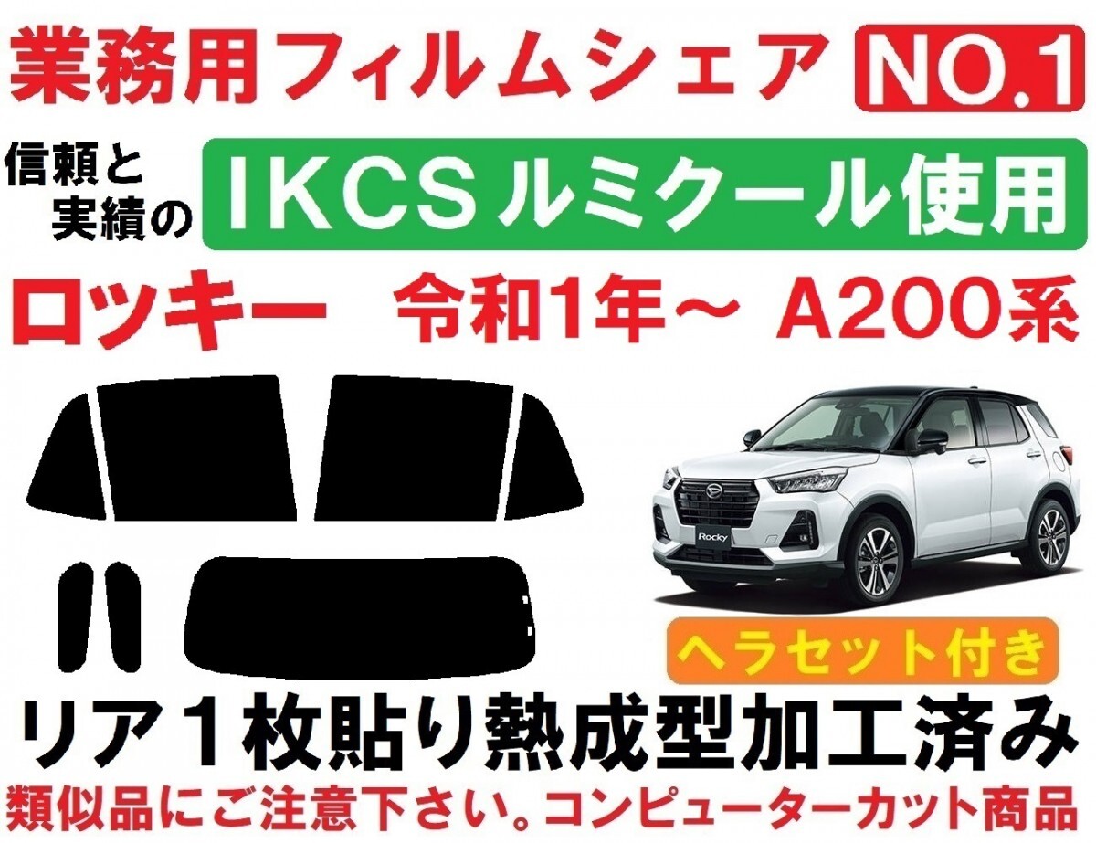 ロッキー A200系用『IKCSルミクール使用』1枚貼り成型加工済みフィルム、リア5面セットです。(専用施工液付属) ・信頼の品質と実績で永い間業務用フィルムとして選ばれ続けているIKCS製品です。 ・業務用フィルムの中で最も信頼性の高い、ベストセラー商品です。 ・詳しくはIKCS株式会社HPをご覧ください。 ※『ルミクール』は当店でも 施工実績・販売実績NO.1の超人気商品です。 令和1年11月~ A200S A201S A202S A210S ロッキー に適合します。 ※適合などご不明な点は、お気軽にご質問下さい。 ◇◆◇当商品には、画像2のヘラセットが付属します◇◆◇ ■滑りの良いシリコンタイプのゴムヘラ スムーズに水切り(清掃)・貼り付け後の水抜きが出来ます。 実際の業務でも色々な物を試しましたが、シンプルなこの形状・このメーカー・このグレードの物が1番使いやすいです。 柔軟性が有りガラス(フィルム)に密着するため、フィルム折れも防げます。 ■使いやすい厚みとコシの有るプラヘラ 形状は似ていても各メーカーにより硬さ・厚みなど色々と有ります。 慣れていない方でも扱い易いように少々柔らか目の物になります。 ヘラ先にはフッ素樹脂加工のクロスを貼って有りますので、滑りが良くキズを防止します。 ■ワイプオール(不織布ワイパー) 布同様の丈夫さと紙の持つ吸水性を発揮。糸くずの発生が無く均一素材のため異物混入の心配が有りません。 施工前のガラスクリーニング~施工時にフィルムが触れる可能性の有るガラスの周りのゴム部品の拭き取り清掃~吸水等に大変便利です。 全て実際の業務に使用している物で、その中から使いやすい物を選んでいます。 ヘラセットがご不用の場合、フィルムのみの商品も有ります。こちら ◇◆◇精密コンピューターカット◇◆◇ 貼りやすさを最優先に各部のサイズ・形状など微調整し、改良を重ねた独自のデータを製作。 高精度な最新・大型カッティングプロッターによるカットで正確で滑らかなカットラインを再現しています。 施工業者だからわかる、貼りやすいサイズ・形状に仕上げています。 ◇◆◇リア1枚貼り成型加工済み◇◆◇ リアガラスの湾曲に合わせて熱成型加工して有りますので、平面に貼るのと同様にたるみが出ず1枚貼り出来ます。 ※最適な状態に成型加工して有りますので、ヒートガン(ドライヤー)等は不要です。 リアの他、ドア2面もたるみが出やすいので成型加工しています。 ◇◆◇専用施工液付属◇◆◇ 軽視されがちな施工液ですが、貼りやすさに大きく関わる部分になります。中性洗剤などで代用せず、必ず付属の専用施工液をご使用下さい。 濃度については車種・季節などにより変わりますので、個別にお知らせ致します。 国内シェアNO.1の『ルミクール』を使用しています。 ルミクールは経年退色が極めて少ない着色加工技術はもちろん、安定した冷暖房効率をアップする熱線遮断効果や断熱効果、内装を守り日焼けを防ぐため、全てのフィルムで99%の紫外線カットを実現しています。 ガラスの飛散防止効果で高い安全性を保ち、ハードコートタイプなのでキズにも強いカーフィルムです。 改良を重ねながら 信頼の品質と性能で、永い間業務用フィルムとして選ばれ続けています。 ■フィルムの種類■ 可視光線透過率 3% NS-003HC 可視光線透過率 7% NS-008HC 可視光線透過率13% NS-015HC 可視光線透過率20% NS-020HC 可視光線透過率30% NS-030HC 可視光線透過率46% NS-045HC ■全商品、キズに強いハードコート・紫外線(UV)99%カットです。 ※可視光線透過率が低くなるほどフィルムの色は濃くなります。 サイドとリアで濃さを替えたり等、可能です。 部分的にフィルムが必要になった場合、単品販売も承ります。 他にもロッキー用フィルム、各種出品中です。こちらもご覧ください。 下記の車両にも適合します。 ・トヨタ ライズ(A200A・A210A) ご不明な点など有りましたら、お気軽にご質問下さい。 | ||