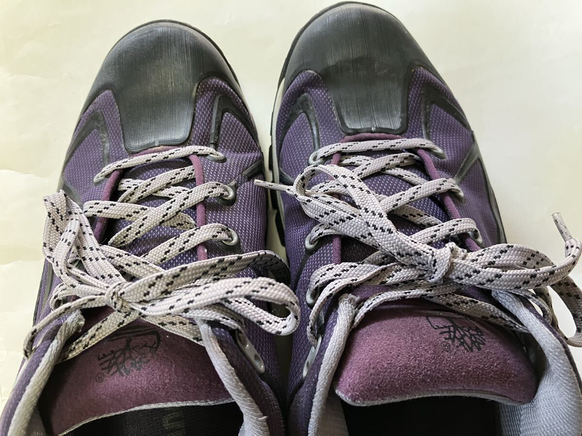 Timberlandのパープル系スニーカーです。トレッキングシューズとしても活躍します。全体的に使用感があり、アッパー部分やソールの側面に擦れや汚れが見られます。また、靴紐にも若干の毛羽立ちがあります。機能的には問題なく、まだまだご使用いただけます。| 出价者 | 信用 | 价格 | 时间 |