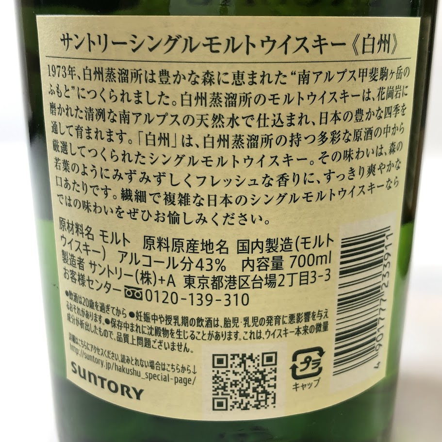 〇サントリーシングルモルトウイスキー 白州 NV 1点 内容量:700ml アルコール度数:43%
