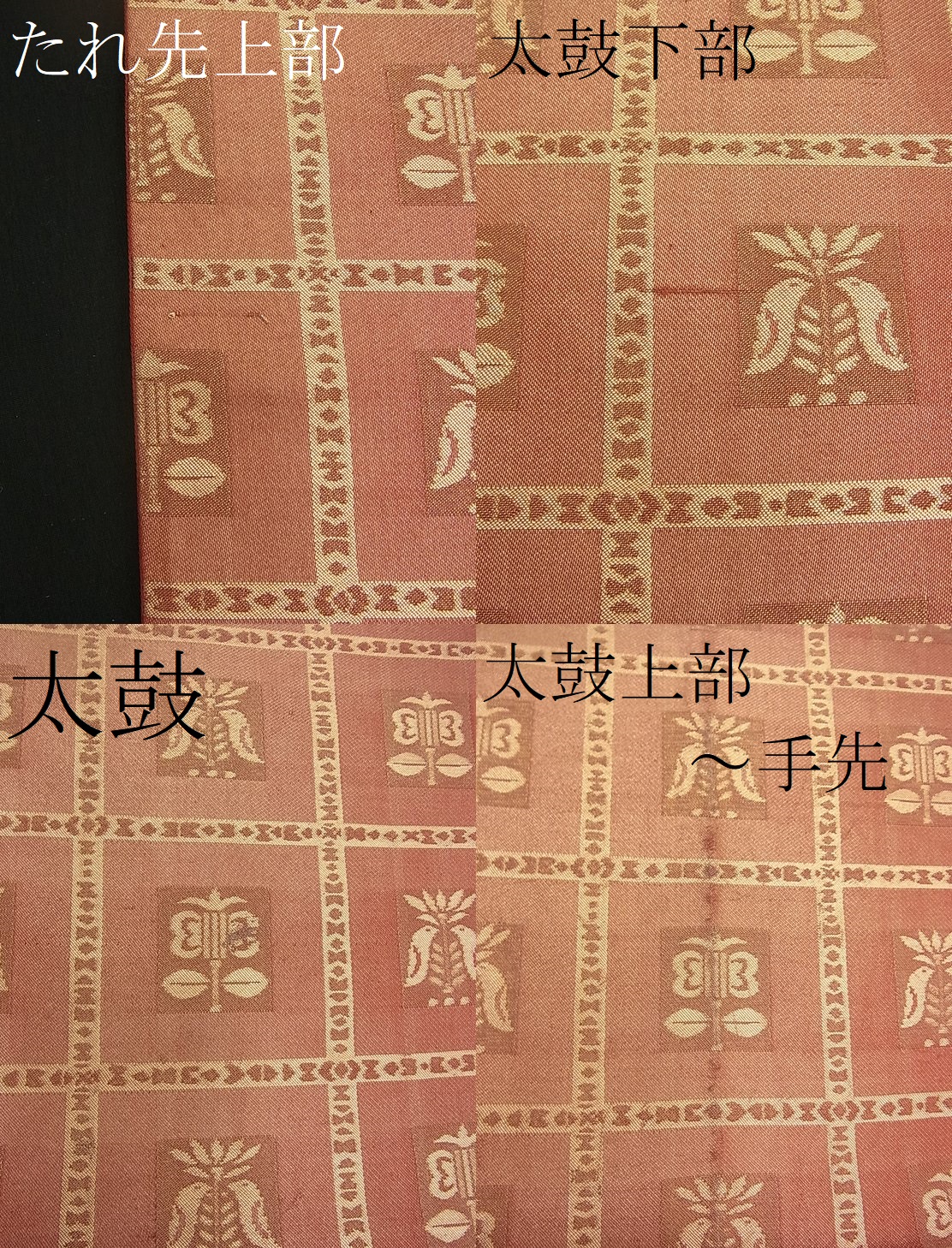 | 【正絹・芯なし】 状態は接写画像のように たれ先上部・太鼓下部・太鼓にスレ、太鼓に薄い汚れ、 太鼓上部から手先に折れ山の薄い線汚れがございますが その他特に目立ったシミ汚れなどもなく大変良い状態です。 大変上質な逸品になります。 お安く出品致しますので、是非この機会にいかがでしょうか?