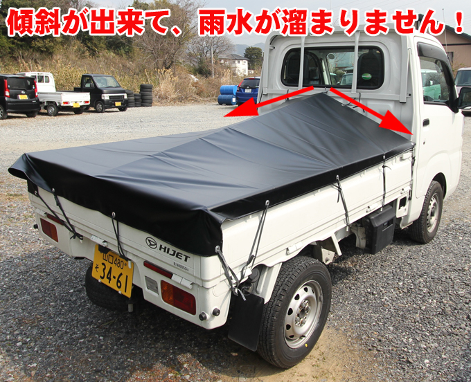 | 雨や雪の日、荷台シートに雨水や雪が溜まって重くなったり、作業がしにくい・・・ そんな経験はございませんか? このお悩みを解決してくれる便利グッズと、当店人気の荷台シートをセットにしてみました! 本体の前後を車体に引っ掛けるだけの簡単装着で、 シートに傾斜ができて雨水が溜まるのを防ぐので、作業もはかどり、大切な荷物も守ります!