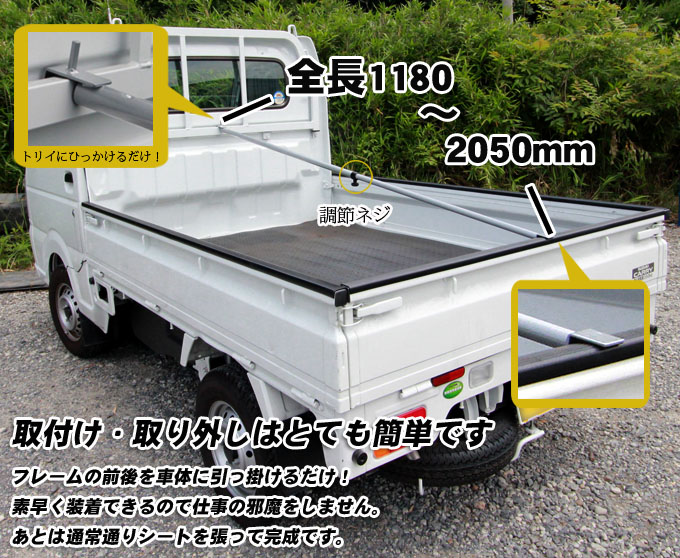 | 【荷台トラックシート黒】 サイズ:175×210cm(軽トラック用) | 【フレーム】 全長:1180~2050mm |