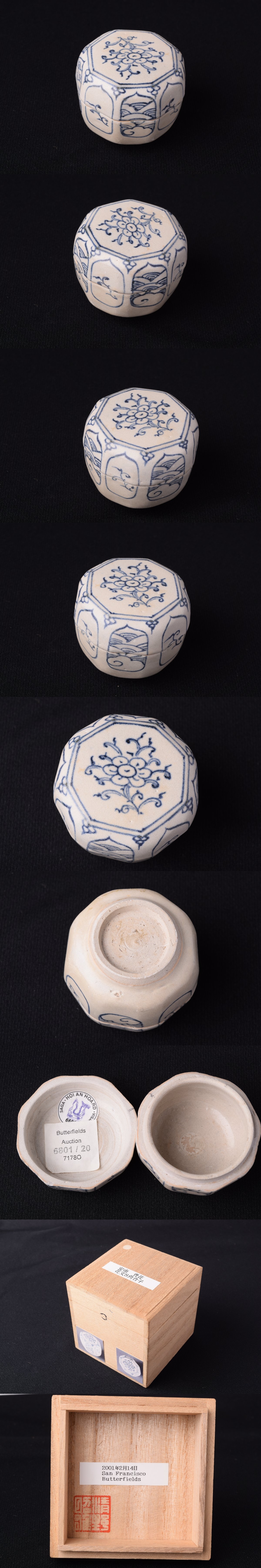 | 商品説明 | 安南青花の八角合子です。白磁地に花文が描かれた上品な一品です。箱付き。箱蓋裏にバターフィールドオークションのメモ書きが見られます。バターフィールドはかつてアメリカ・サンフランシスコを拠点とした美術オークション会社として知られています。経年による擦れ、汚れ、小傷等あります。詳しい状態は画像にてご確認ください。コレクション、小物入れ、飾り物としてもお楽しみいただけます。 サイズ 径:約4.8cm 高さ:約5.5cm |